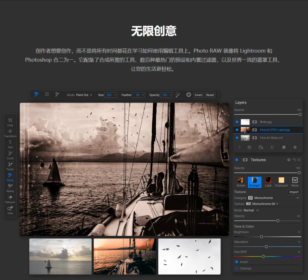 包含内置图层,画笔和高级遮罩工具,可将照片组合在一起并创建复合材料。照片编辑技术,例如实时混合选项,适用于智能图层,智能照片和蒙版优化工具也使得ON1 Photo RAW 成为更高级的照片编辑器;