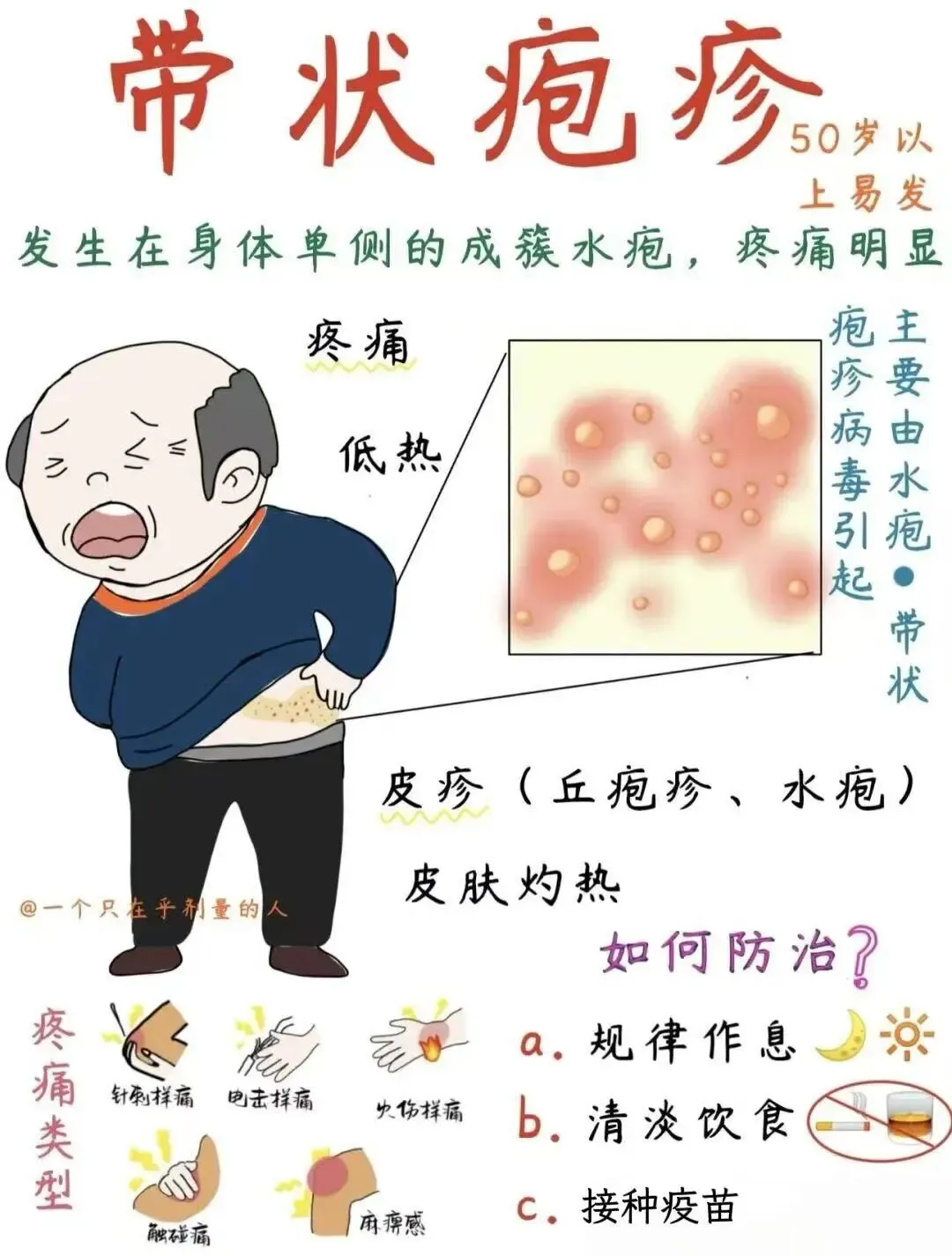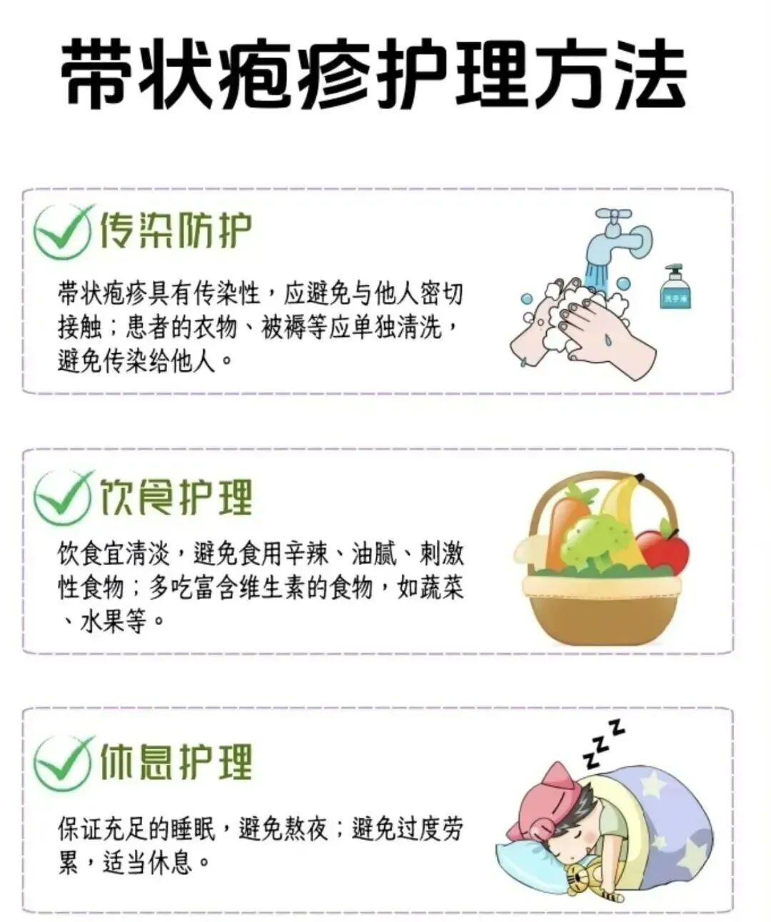 生活注意事项• 保证充足睡眠,熬夜会降低抵抗力!• 避免劳累和压力过大,焦虑会加重疼痛感适当轻度运动(如散步),但避免出汗刺激患处分散注意力:听音乐、看剧、冥想,减少对疼痛的关注• 轻柔按摩周围皮肤(避开疱疹区域),促进血液循环早治疗+科学护理=少受罪!带状疱疹真的不是小毛病,一定要认真对待!大家有什么问题可以评论区留言~