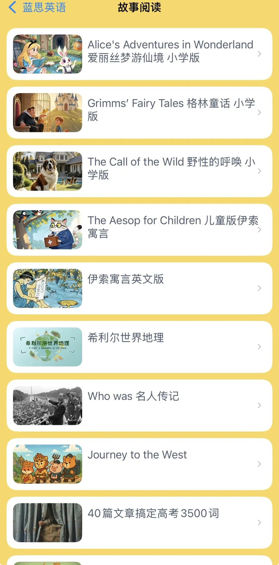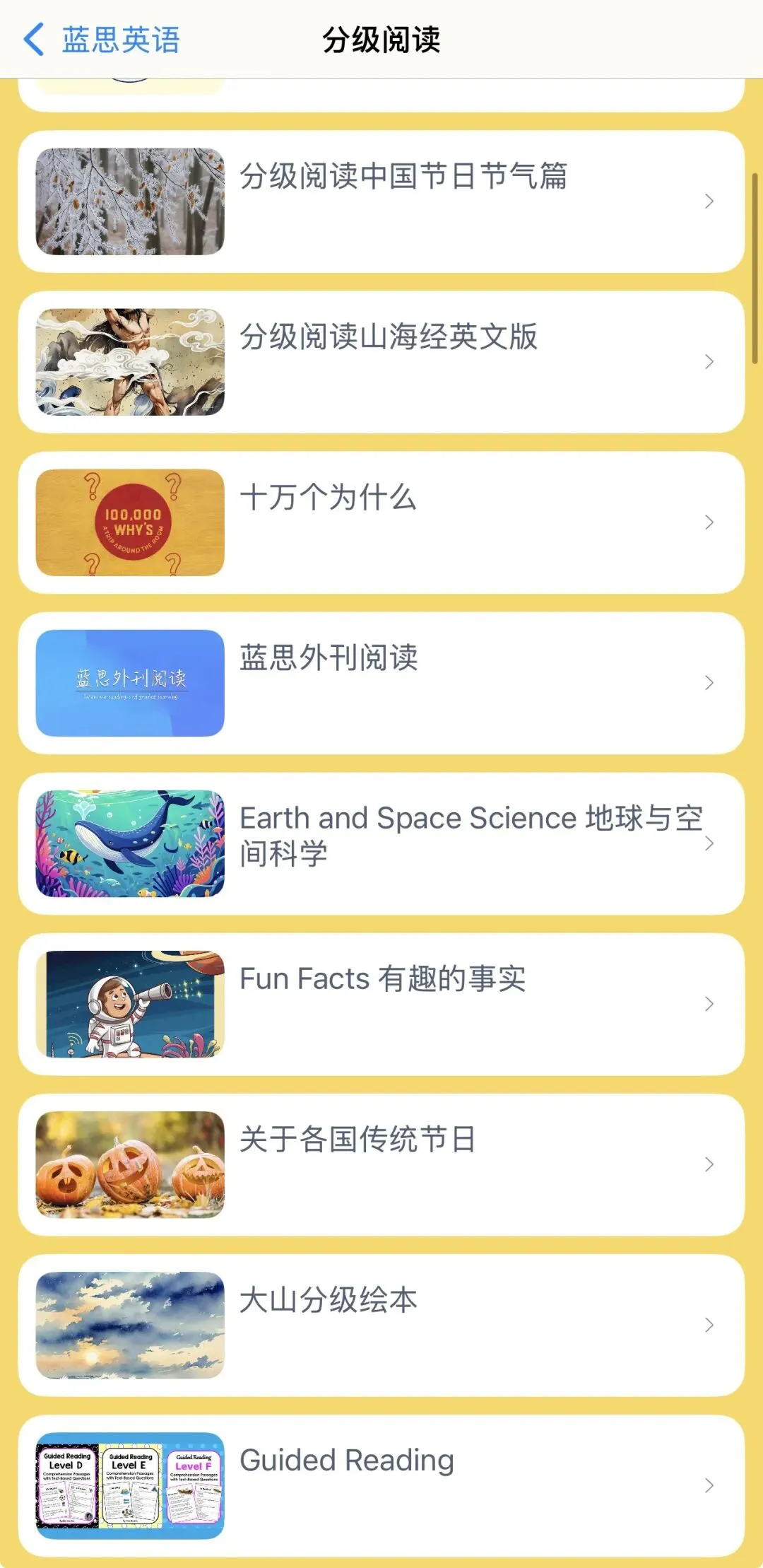 蓝思英语这个APP里包含了市面上绝大部分的英文绘本,如海尼曼、培生、牛津树、大猫、兰登、红火箭、我的第一个图书馆、新概念、Raz自拼、wonders、丽声、学乐、剑桥、牛津少儿、廖彩杏、小猪小象、美国家庭万用亲子英语、国家地理儿童百科、女巫温妮、苍蝇小子、饼干狗、皮特猫等等,种类相当丰富。