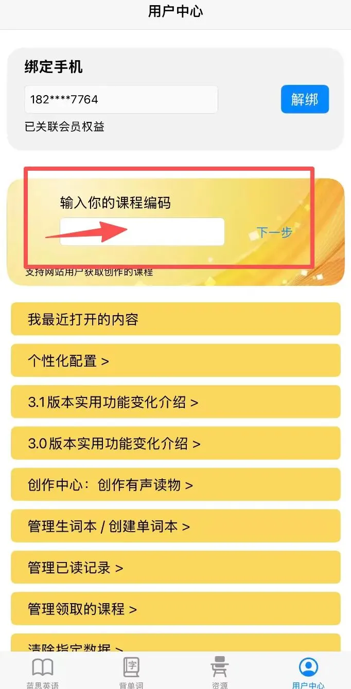兑换流程:打开蓝思英语App右下角点到【用户中心】输入课程兑换码即可在我的资源处看到