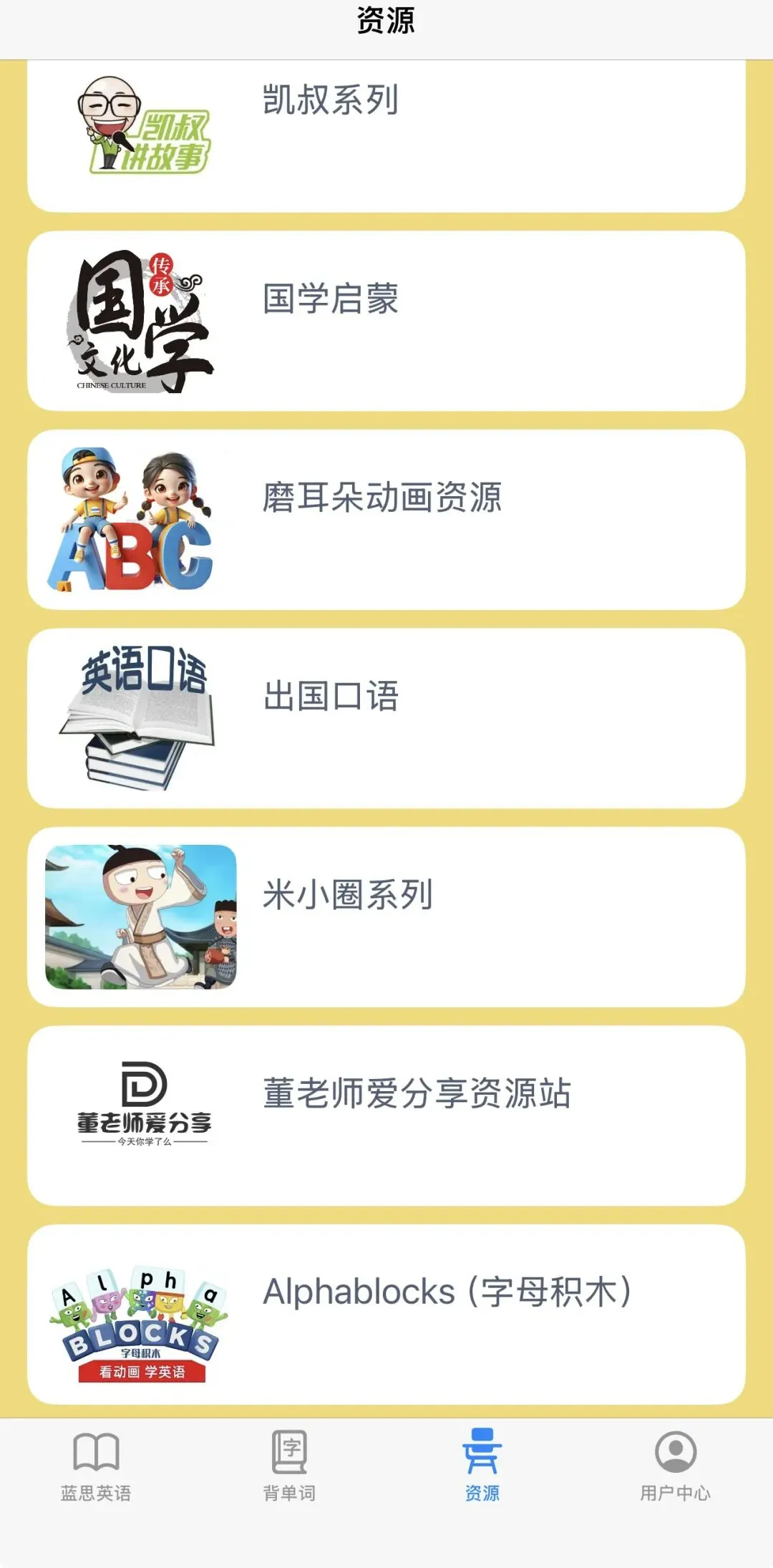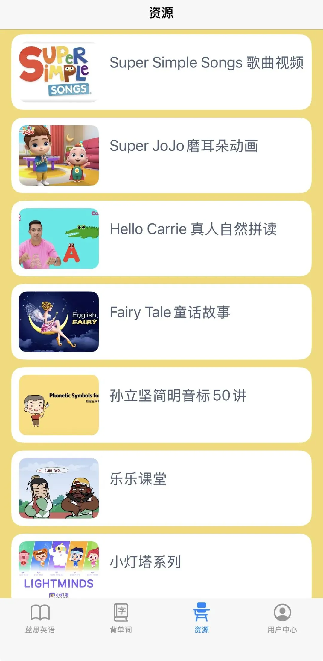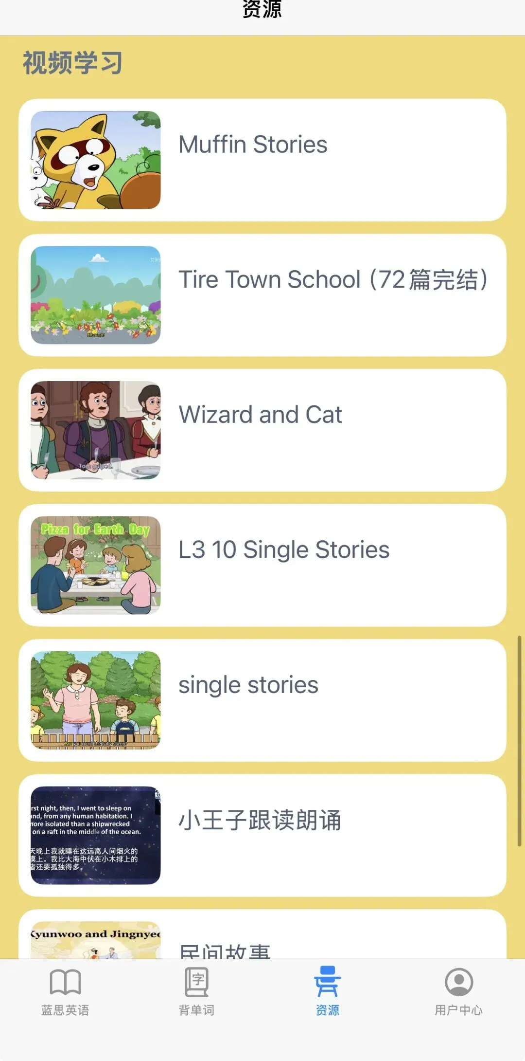 这里的动画资源简直太丰富了,有自然拼读、课程学习、经典故事等,还按照难度分为启蒙、初阶、中阶和高阶。