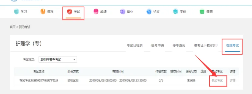 4、点击【考试–在线考试】菜单,在规定的时间 点击【参加考试】按钮,进入考试;注意:当点击【参加考试】按钮,在线考试进入倒计时;