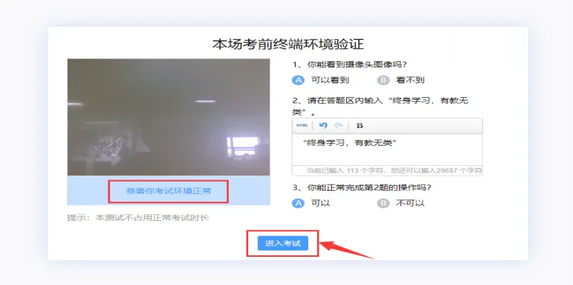 (2)、验证完成后,并且能够正常作答试题,点击底部【进入考试】;