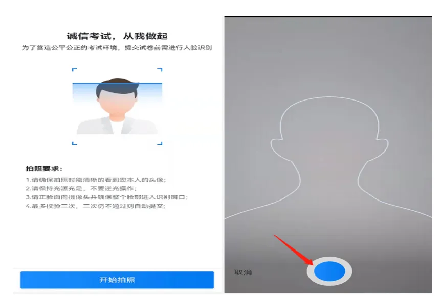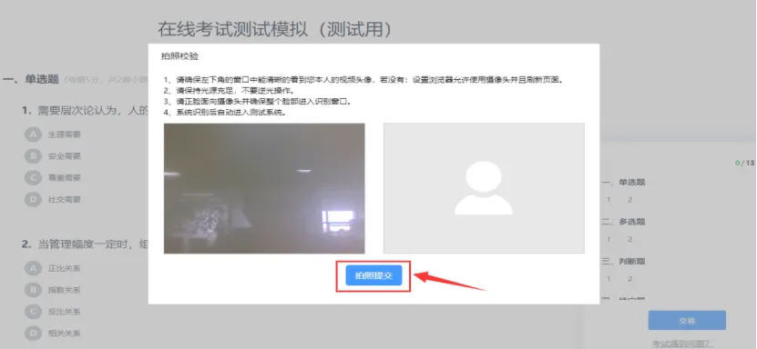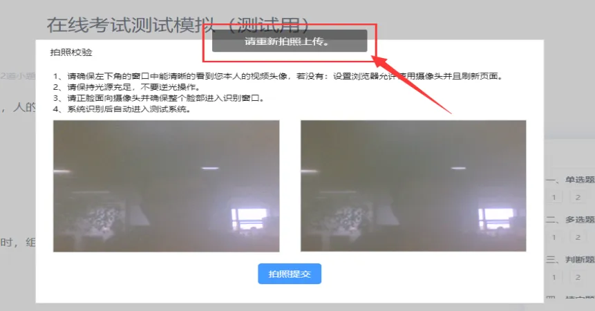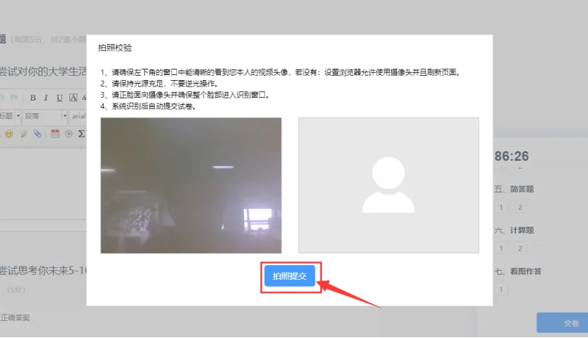 交卷后需要进行交卷人脸识别,点击【拍照提交】,如验证不通过,重复此步骤即可;