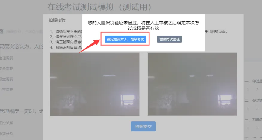 (4)、如三次识别后,任未通过的,可以点击【确定是我本人,继续考试】进入考试,考试结束后学校老师会进行人工审核是否为本人,如审核不是本人的成绩作废;