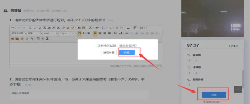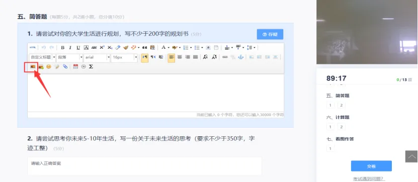 进入考试开始作答,考试过程中会进行抓拍,禁止换人答题;(如需要上传图片的,一定要用上传功能上传,不能直接粘贴图片到答题框)
