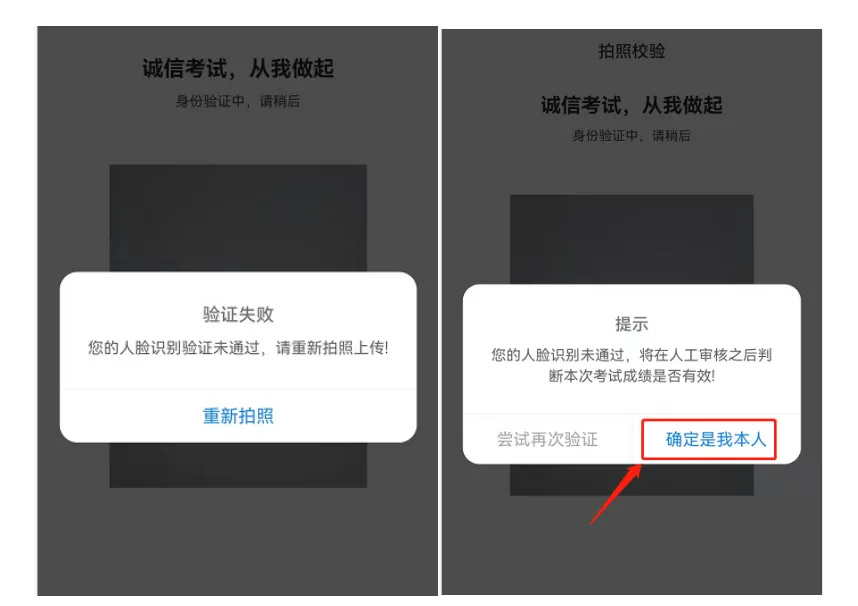 4、拍照后请等待人脸识别校验,如校验未通过,可以重新【重新拍照】,识别3次后,可以点击【确定是我本人】进入考试,考试结束后学校老师会进行人工审核是否为本人,如审核不是本人的成绩作废;