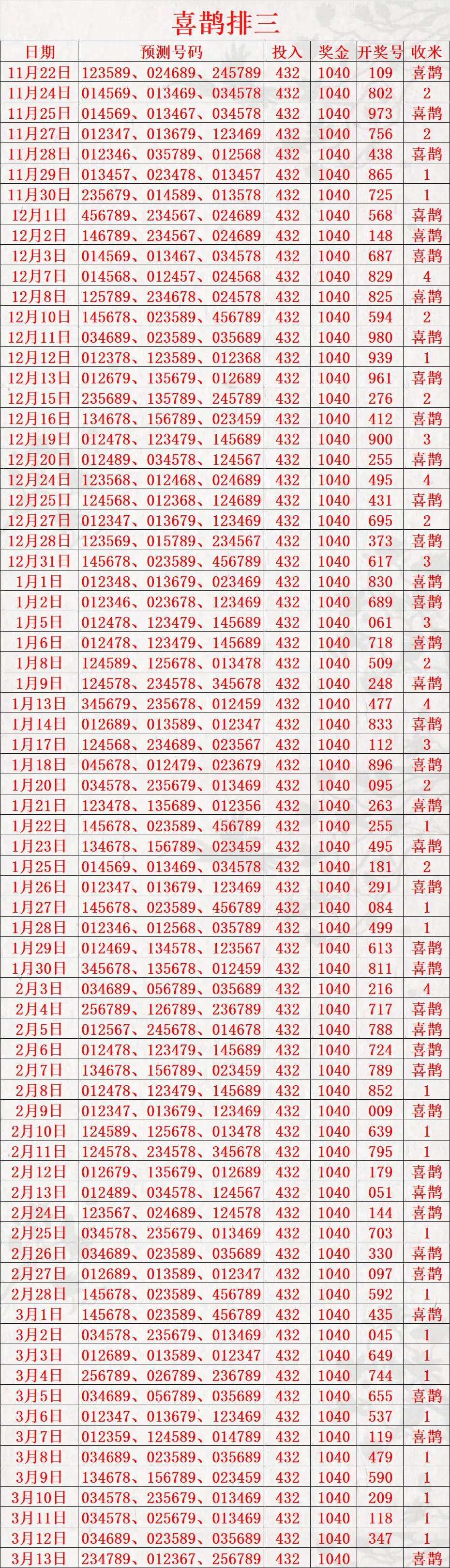 本站文章均为手工撰写未经允许谢绝转载:夜雨聆风 » 3/13今日排三推荐合集,仅供娱乐参考,无任何其他途径!