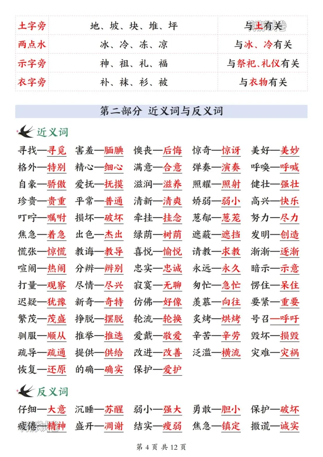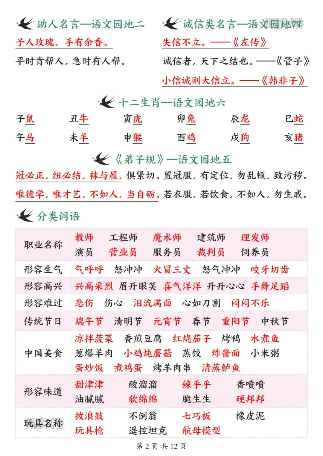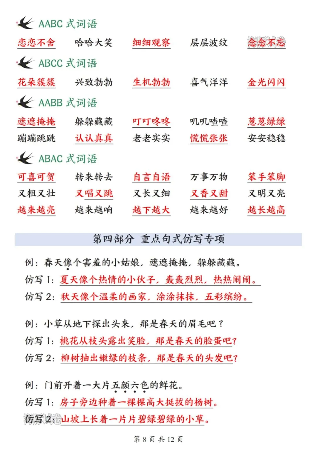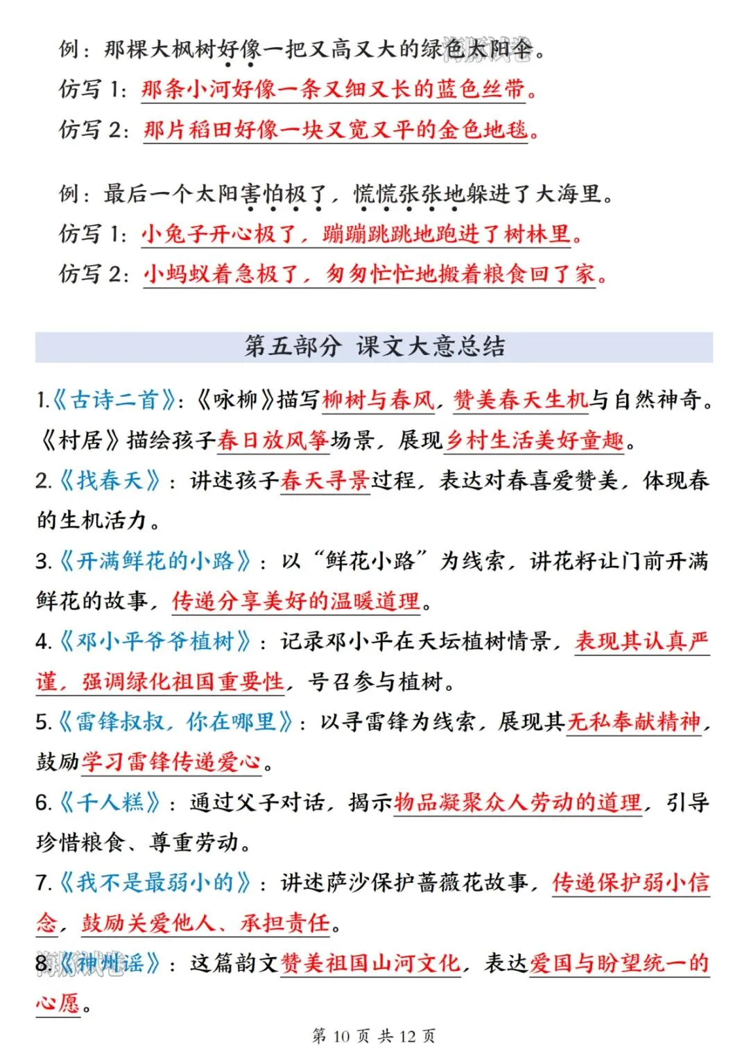 26 新版二年级下册语文开学必备知识点汇总,涵盖全册核心学习内容,是孩子开学预习、日常复习的实用资料。内容分为五大板块,第一板块包含必背古诗、日积月累、名言、十二生肖及各类分类词语,同时梳理偏旁表意知识点;第二板块整理近义词、反义词、多音字、形近字与同音字,夯实字词基础;第三板块汇总课内四字词语、词语搭配及 ABB、AABC 等多种句式词语,丰富词汇储备;第四板块为重点句式仿写专项,搭配经典例句与仿写范例,提升句式运用能力;第五板块总结全册 28 篇课文大意,提炼核心主旨与考点,帮助孩子理解课文内涵。整体知识点系统全面,贴合二年级下册语文学习重点,助力孩子高效衔接新学期语文学习。