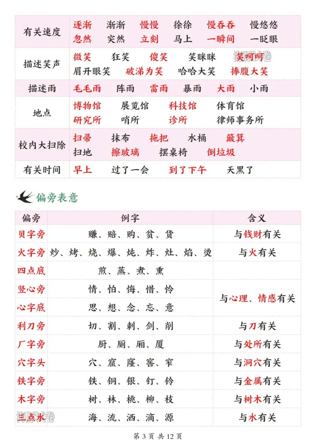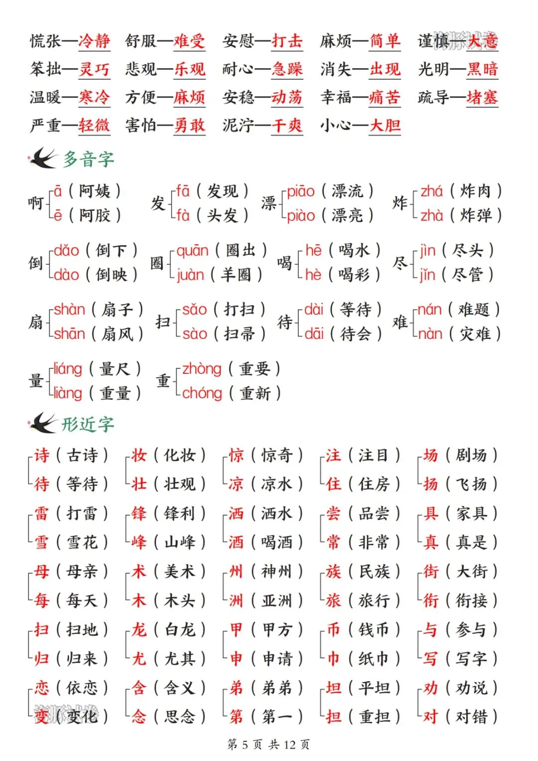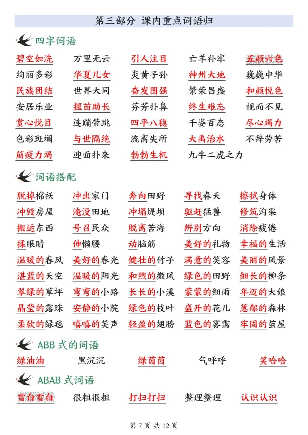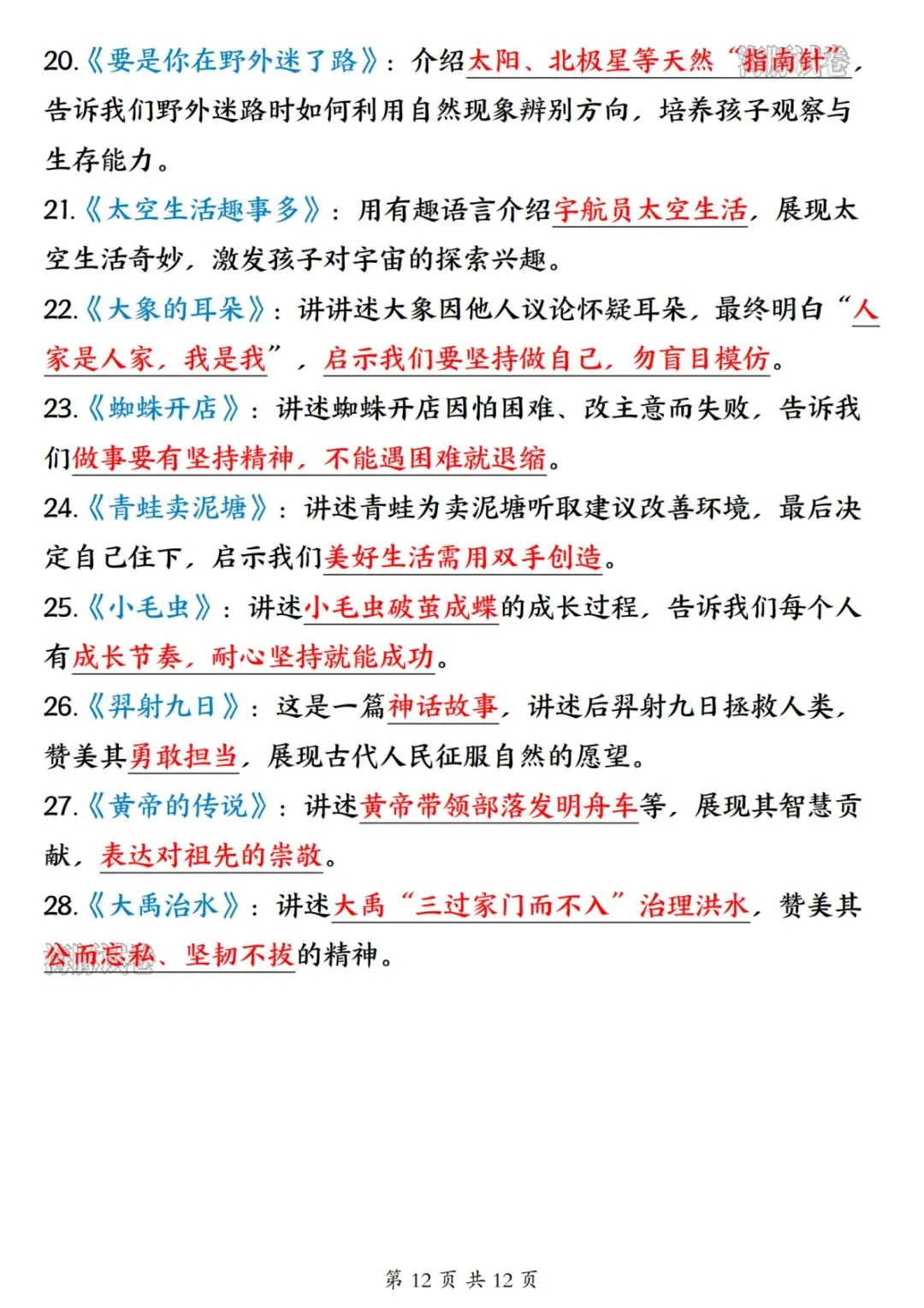 26 新版二年级下册语文开学必备知识点汇总,涵盖全册核心学习内容,是孩子开学预习、日常复习的实用资料。内容分为五大板块,第一板块包含必背古诗、日积月累、名言、十二生肖及各类分类词语,同时梳理偏旁表意知识点;第二板块整理近义词、反义词、多音字、形近字与同音字,夯实字词基础;第三板块汇总课内四字词语、词语搭配及 ABB、AABC 等多种句式词语,丰富词汇储备;第四板块为重点句式仿写专项,搭配经典例句与仿写范例,提升句式运用能力;第五板块总结全册 28 篇课文大意,提炼核心主旨与考点,帮助孩子理解课文内涵。整体知识点系统全面,贴合二年级下册语文学习重点,助力孩子高效衔接新学期语文学习。