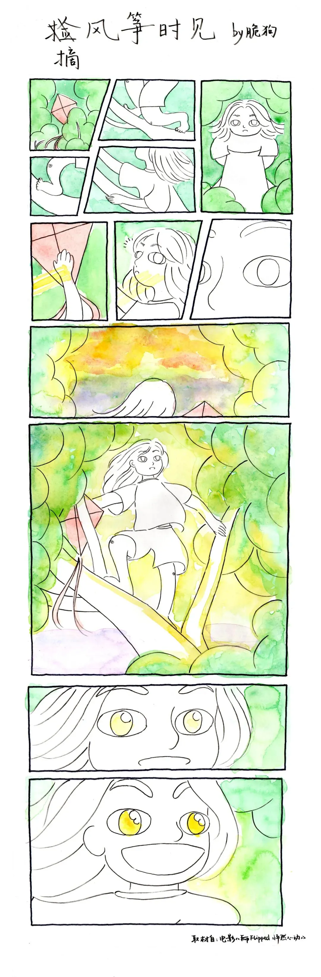 漫画|《摘风筝时见》 这是21年时,参加阮老师的漫画微课,所画的作业——选择喜爱的电影片段,将它画成漫画。我选了《怦然心动》里,女孩爬上白杨树,看见天际美丽黄昏的一段。我喜欢这个片段里,孩童见到美丽世界时,那种纯粹的感动与快乐。