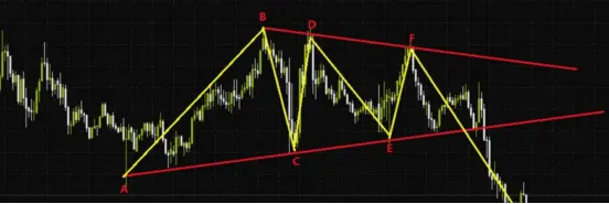 在所示案例中,我们看到价格在F点尚未触及下行的上边压力线便提前掉头向下,这本身已显示出空头抛压的强劲。后续一旦价格有效跌破下方水平支撑线,通常将触发新一轮的下跌趋势。