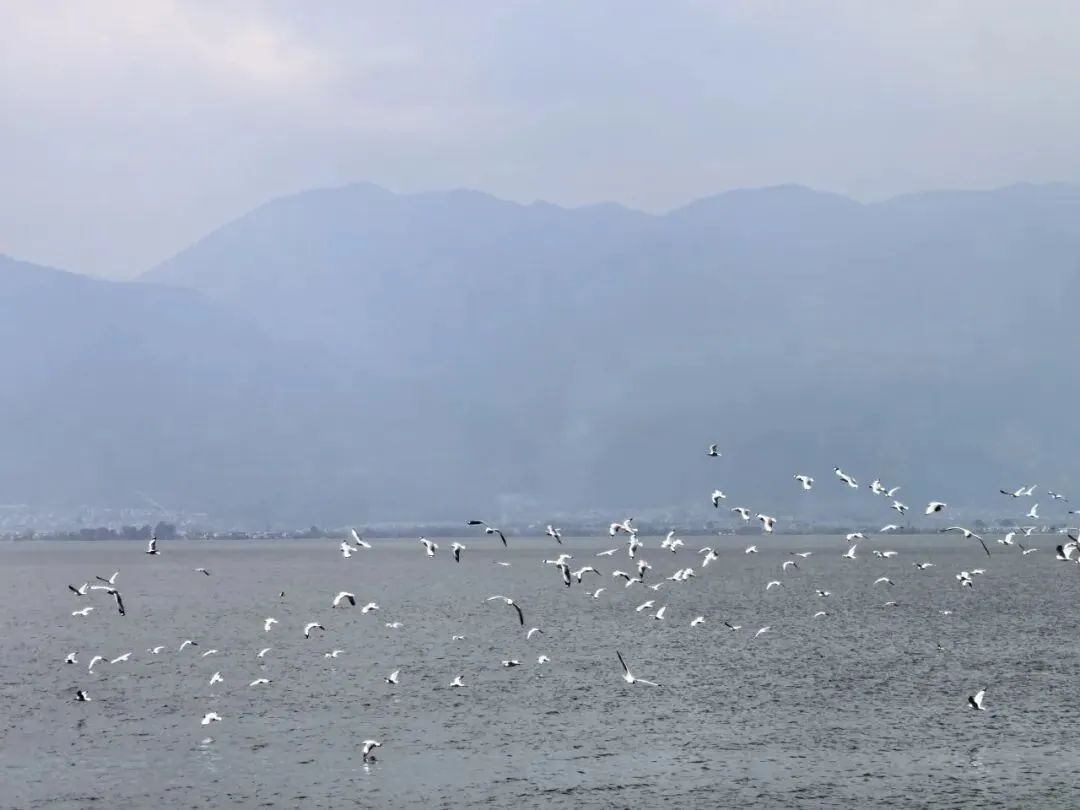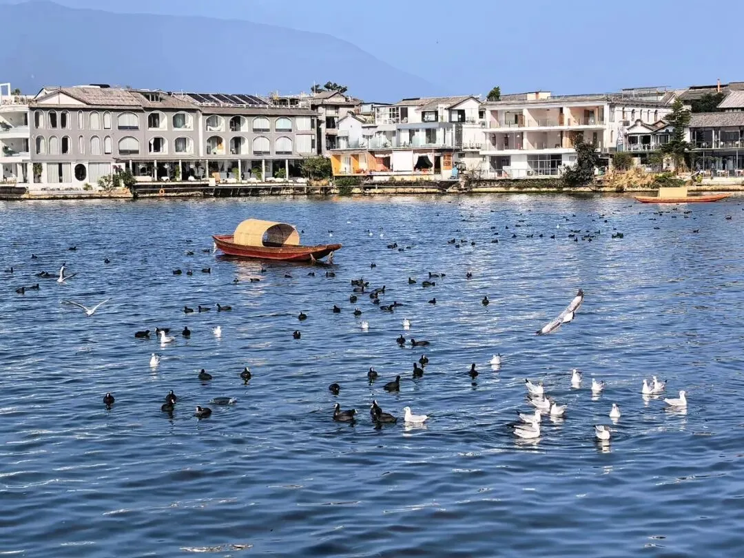 清晨的湖面,被一束束金光劈开,远处的苍山在薄雾里若隐若现。午后,成群的海鸥掠过水面,白色的翅膀在蓝天下划出温柔的弧线。到了双廊,青瓦白墙的民居沿着湖岸铺开,乌篷船在水鸟的簇拥下轻轻摇晃。