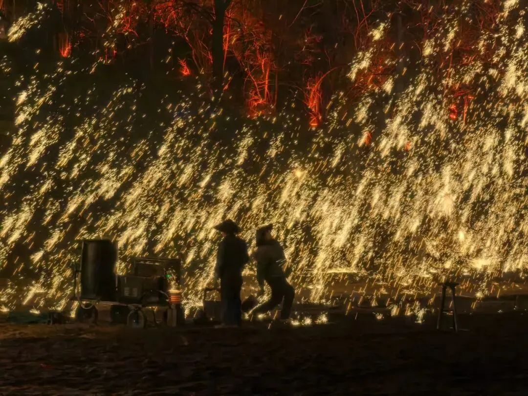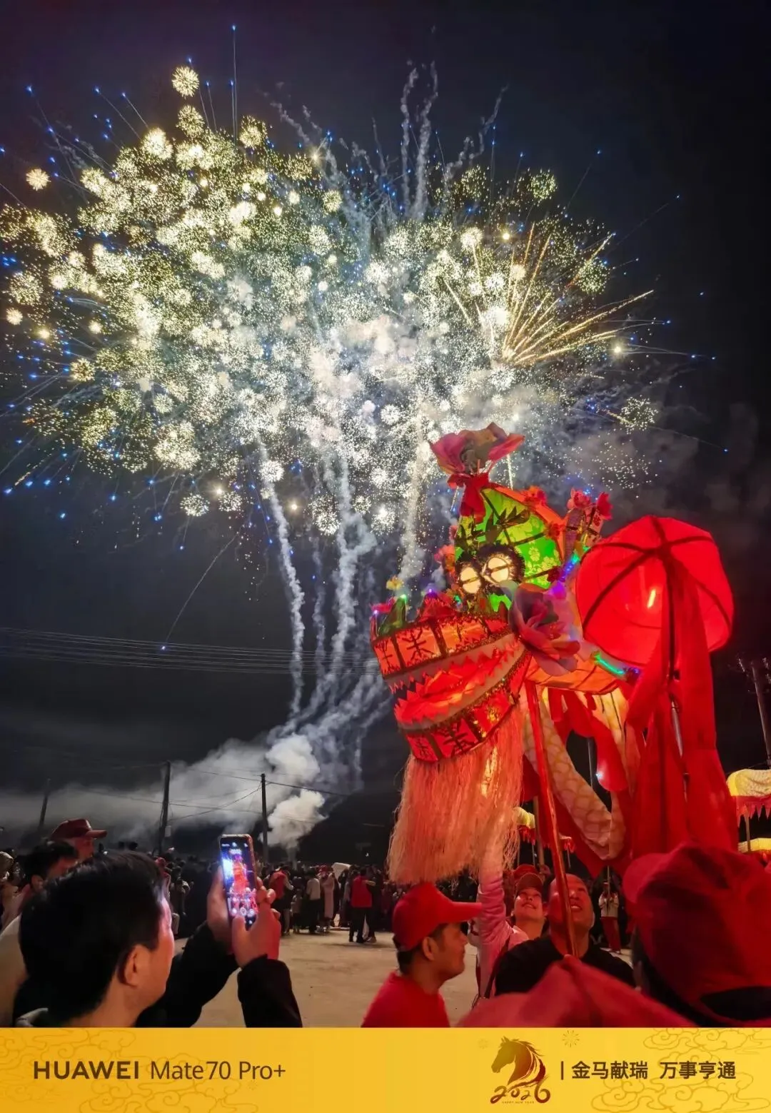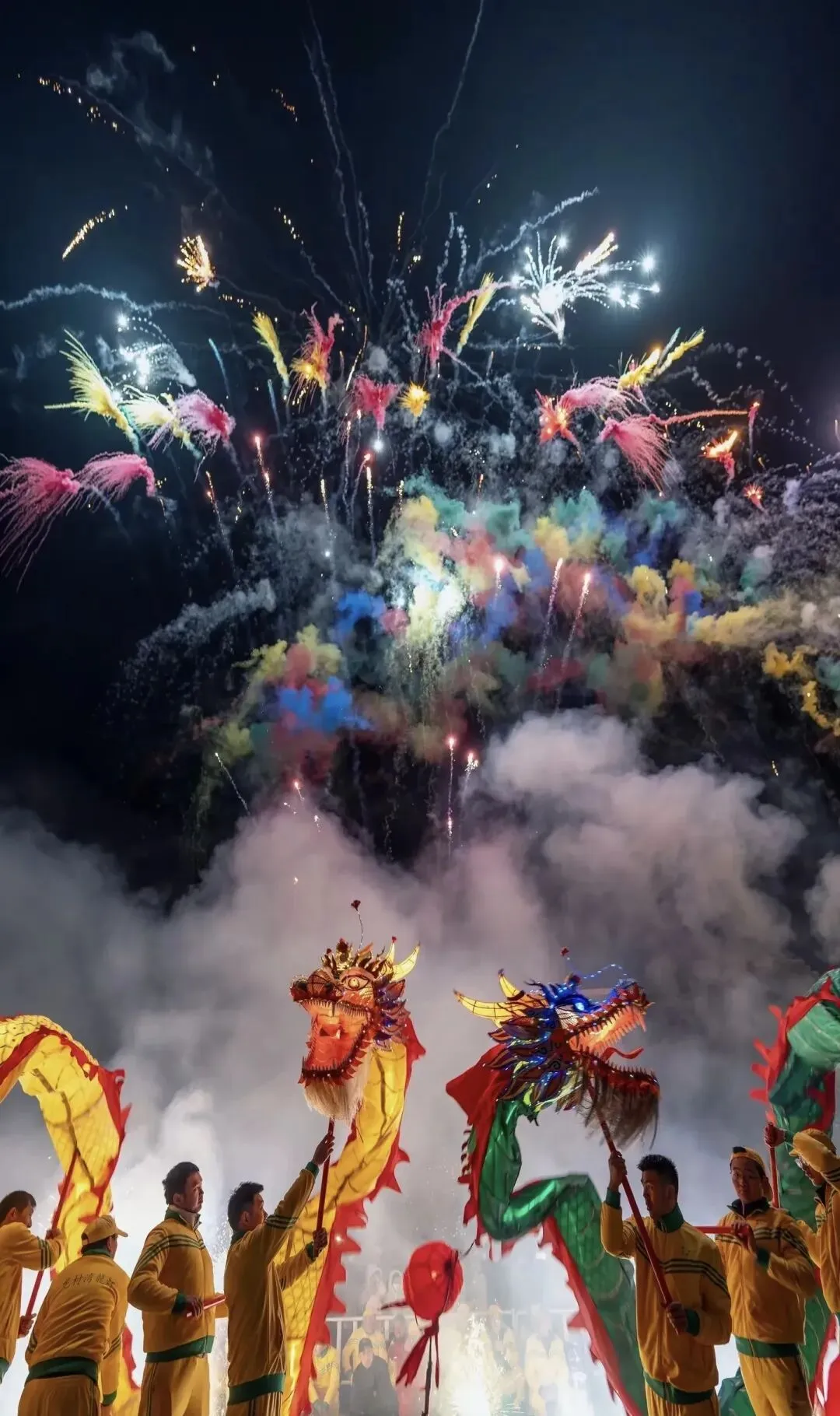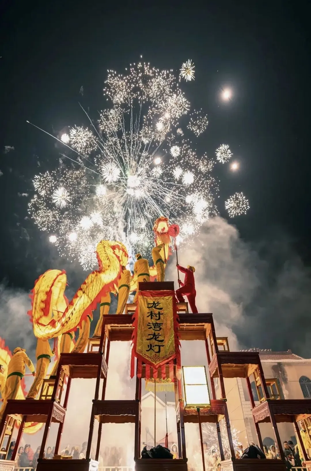 烟花在夜空绽放,木梯搭起的高台之上,龙灯在夜色里翻腾起舞。