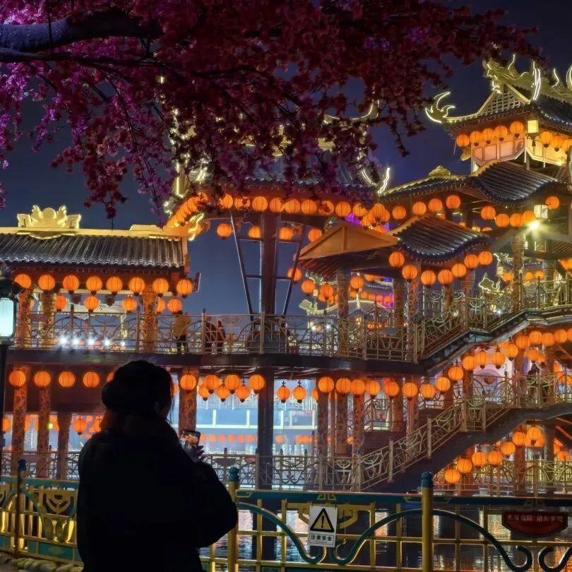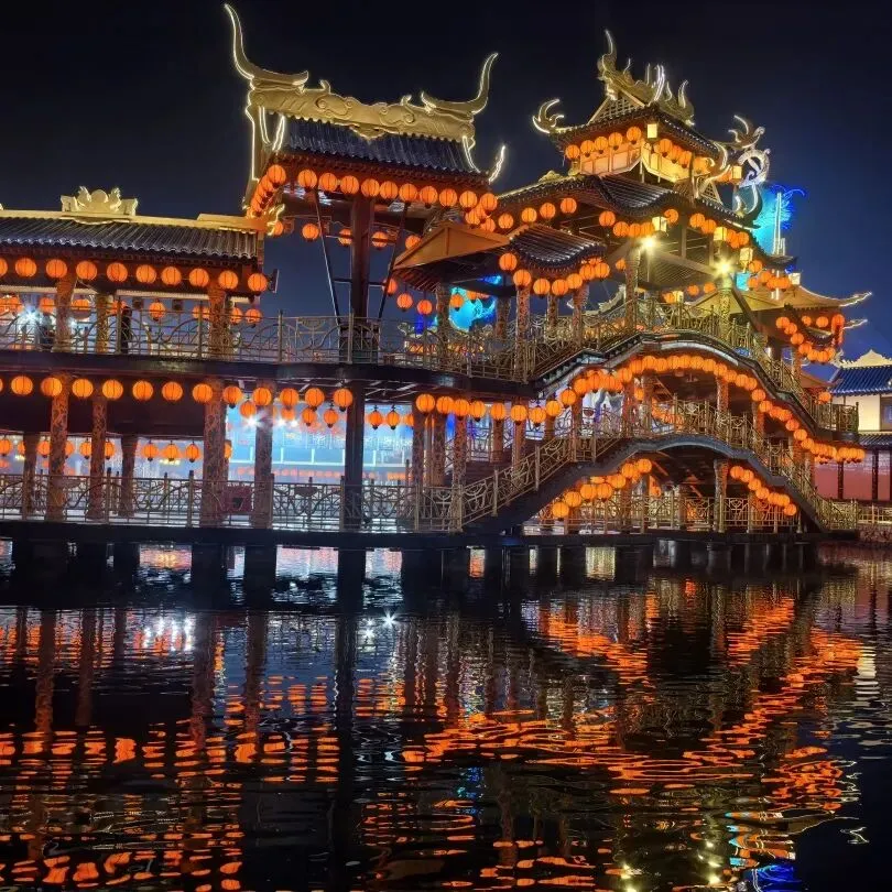 红灯笼串起飞檐翘角,廊桥的灯火在水面漾开碎金,宋式楼阁在夜色里晕开温柔的轮廓。