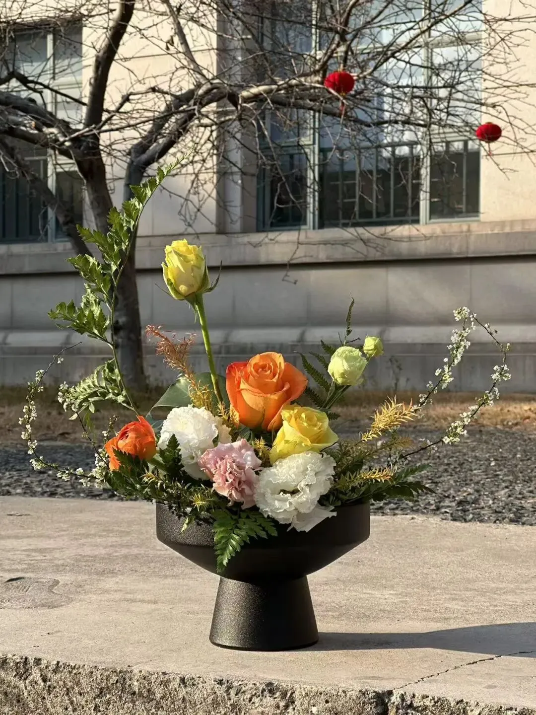 暖橙与鹅黄的玫瑰在花器里舒展,白色洋桔梗晕着温柔,雪柳的细碎白花缀着春日的期许。