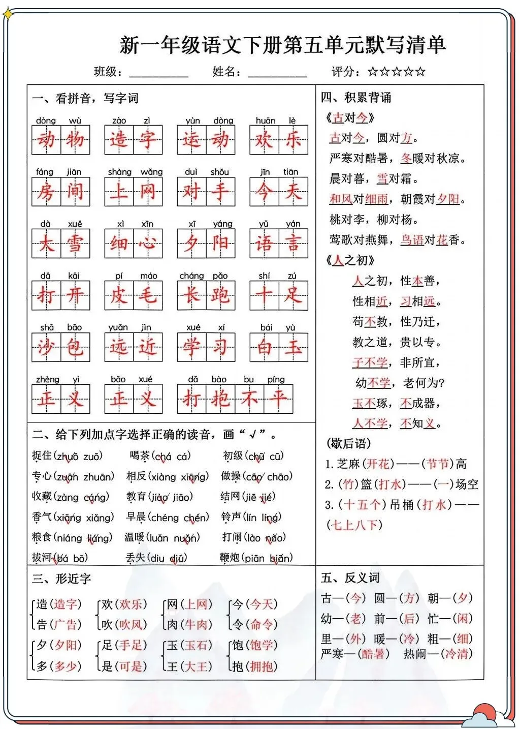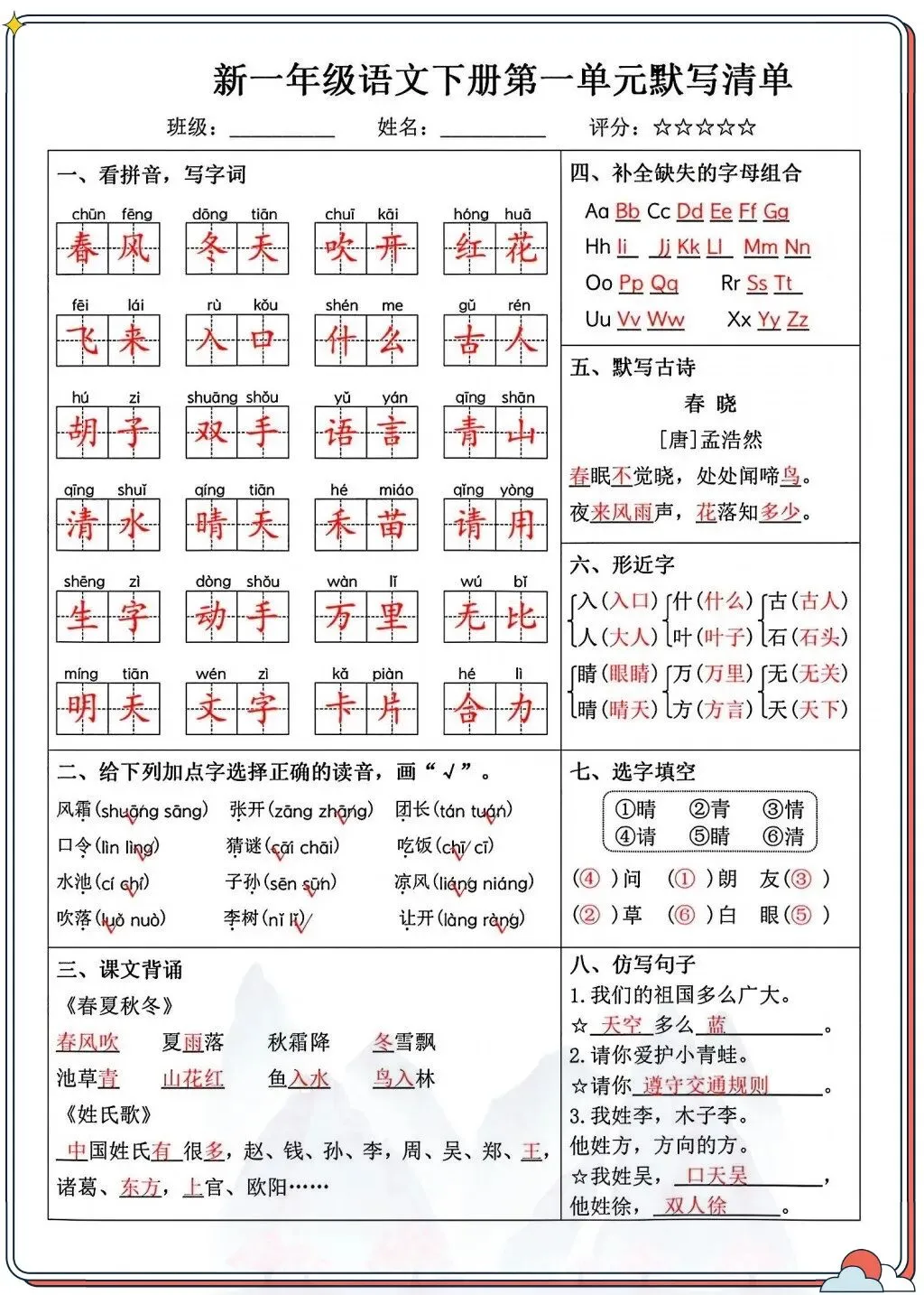 一年级语文下册默写清单|高效巩固基础-可打印