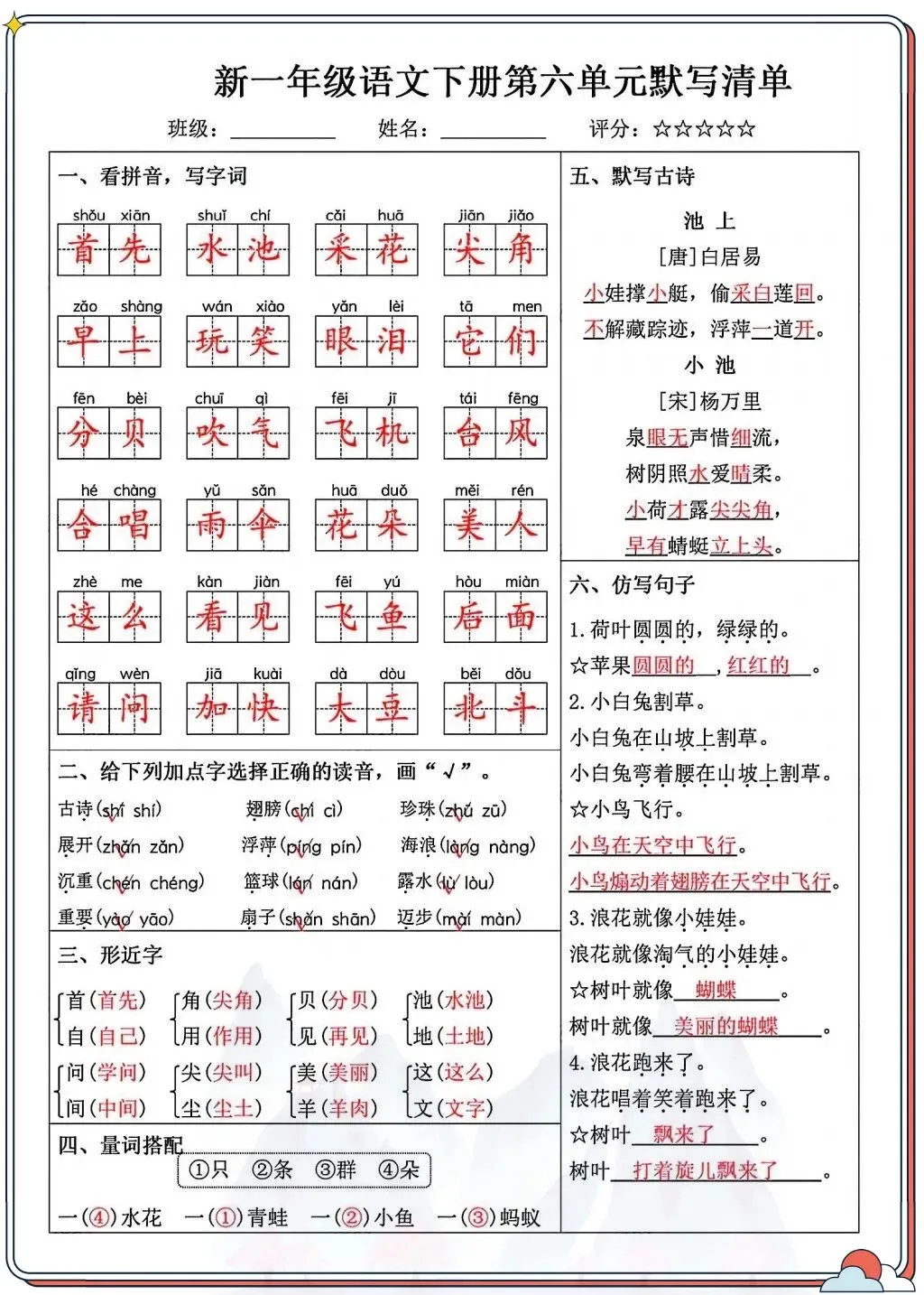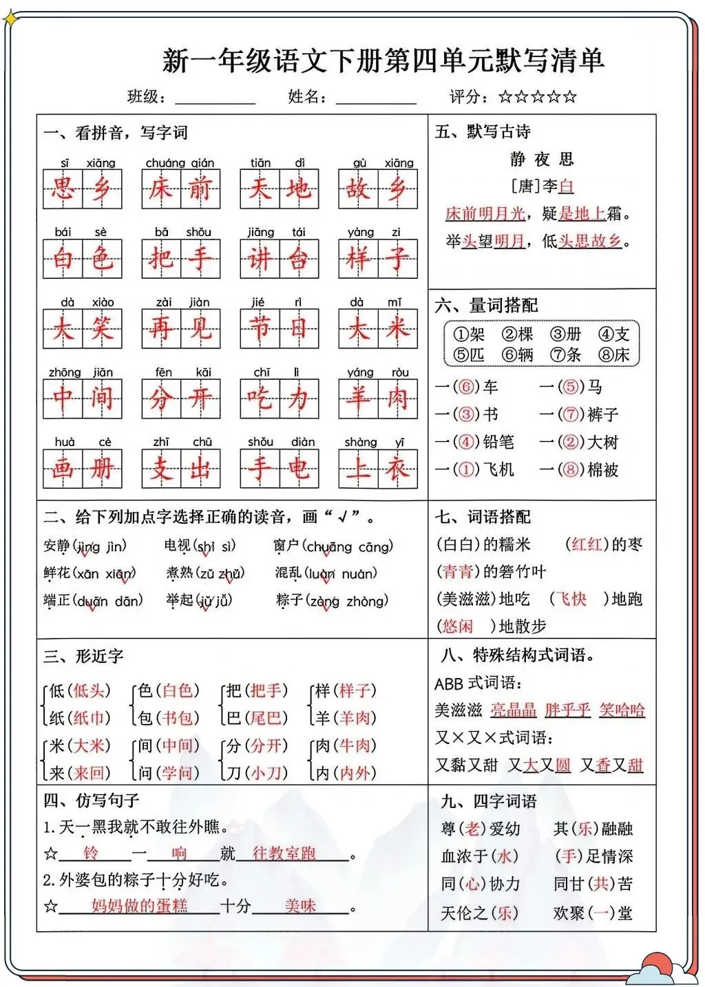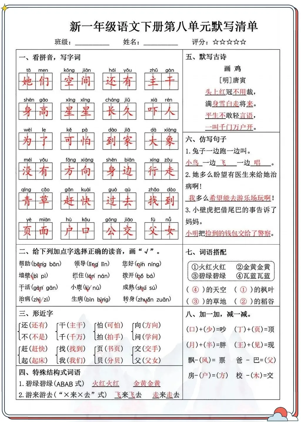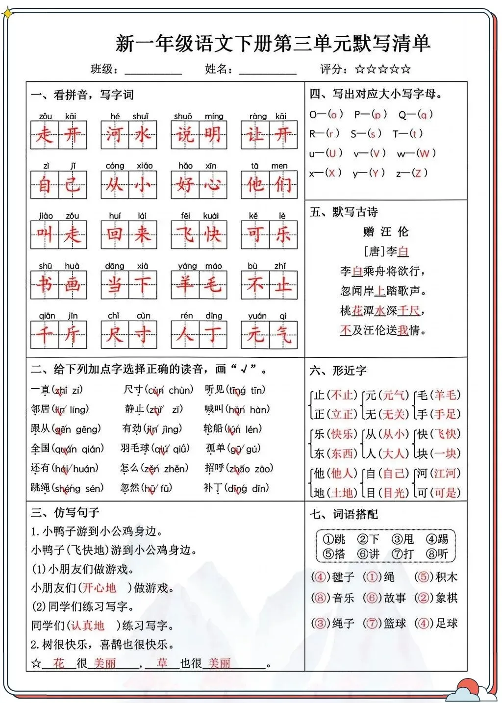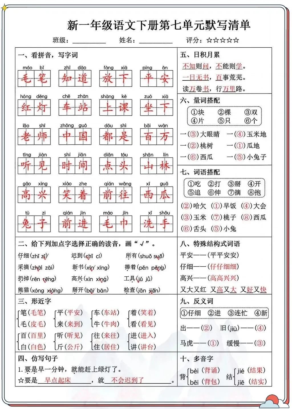 涵盖看拼音写字词、字音辨析、形近字、古诗背诵等核心考点,贴合课本进度,孩子每天10分钟就能系统巩固。从字词到句子,从积累到运用,全面覆盖一年级下册重点,让孩子默写不丢分,语文基础更扎实!