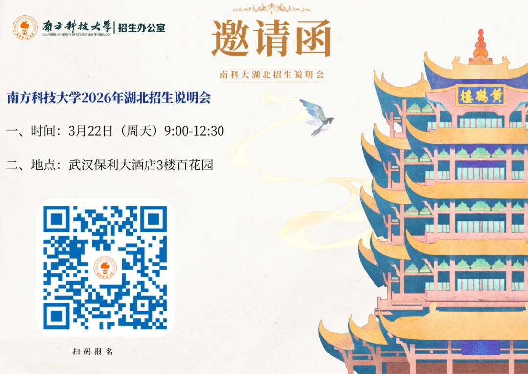 南方科技大学将于2026年3月22日在武汉市保利大酒店举行2026年招生说明会,多位嘉宾将到场作报告,与家长和考生面对面交流,答疑解惑。欢迎参加!