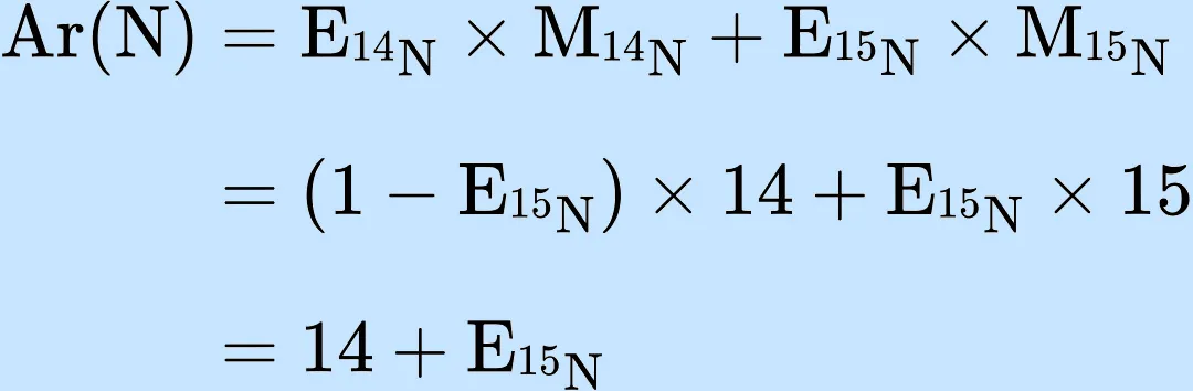 以氮元素为例,氮元素有两个同位素,分别为14N和15N,通常计算时,14N原子量取14,15N原子量取15,带入可得氮元素的原子量: