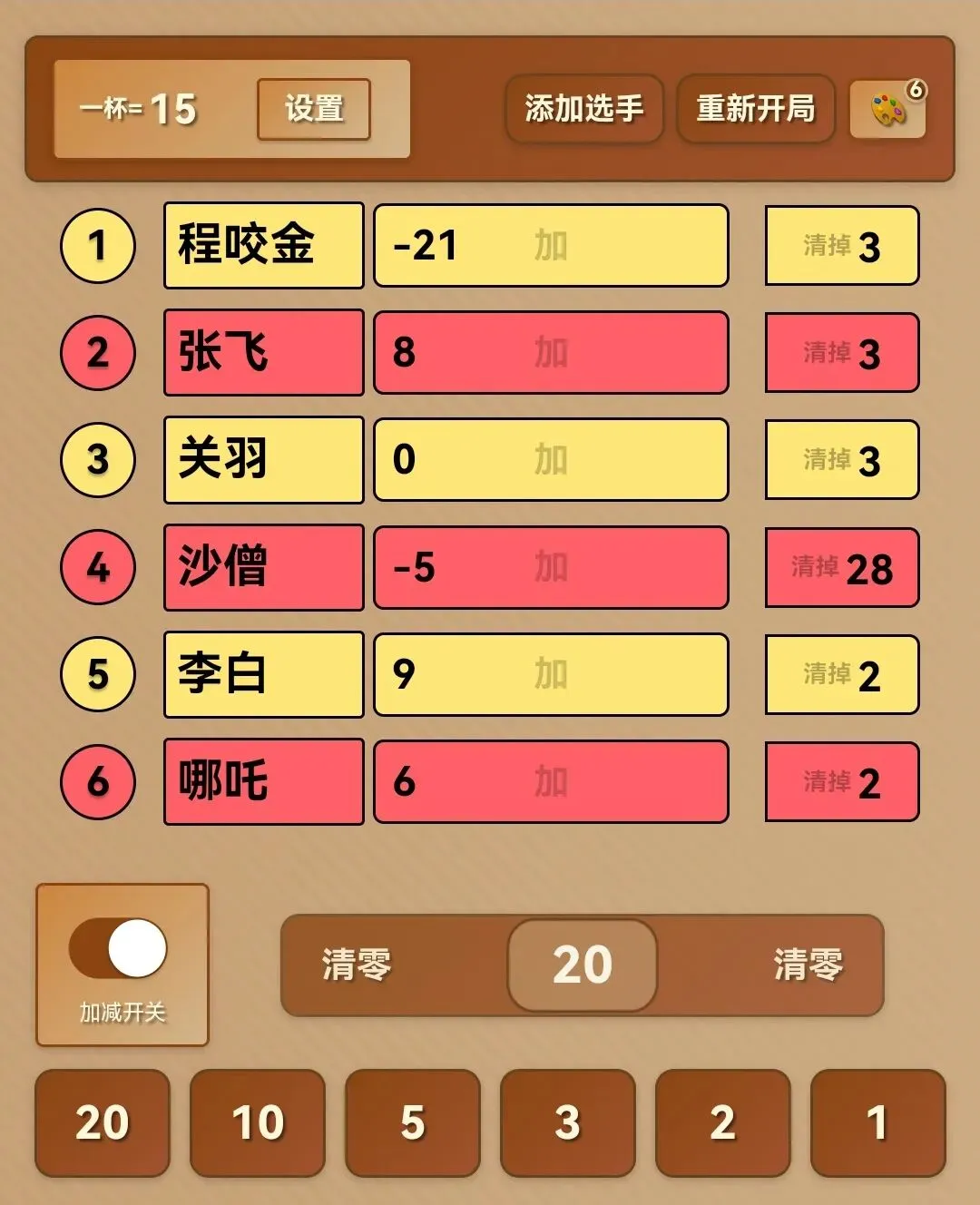 每个选手右侧都有清掉X按钮(X为已喝杯数):