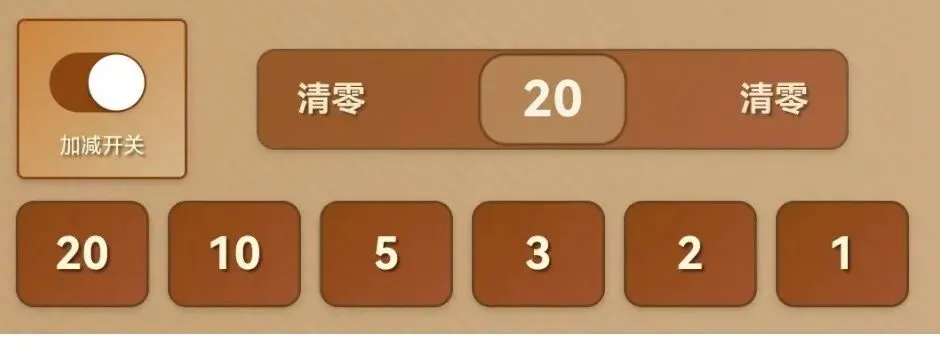 – 底部数字按钮(20/10/5/3/2/1):点击对应数字,数据将添加到公杯位置,公杯默认为1,点击数字按钮,公杯数据累加,如你要加13,则可以点击10和3,要加8,则可点击5和3,任何数字都可以通过底部数字按钮凑够,也可以点击公杯本身(当前图片中20的位置),进行一次性输入,清零按钮则清除公杯数据,重新输入。