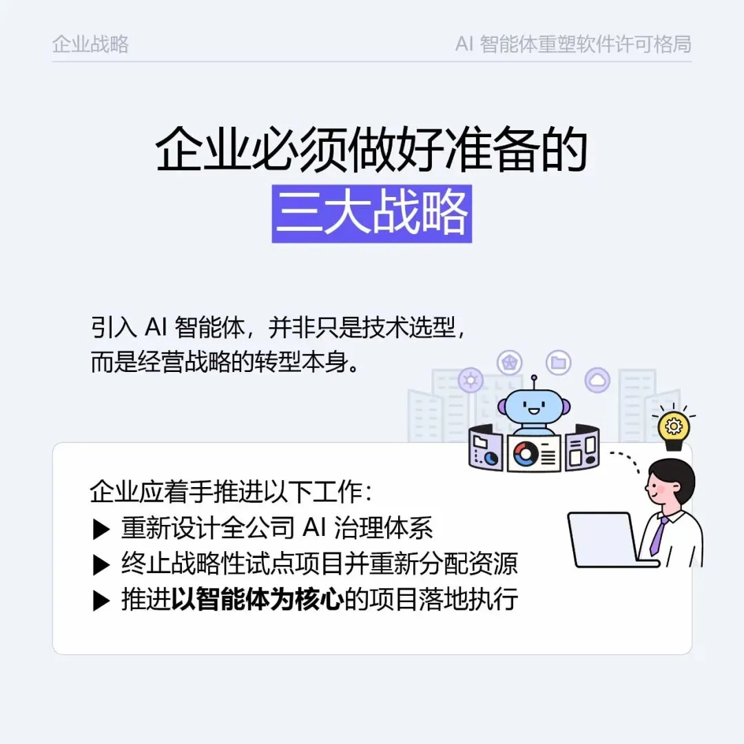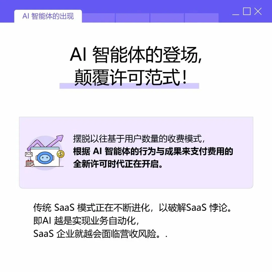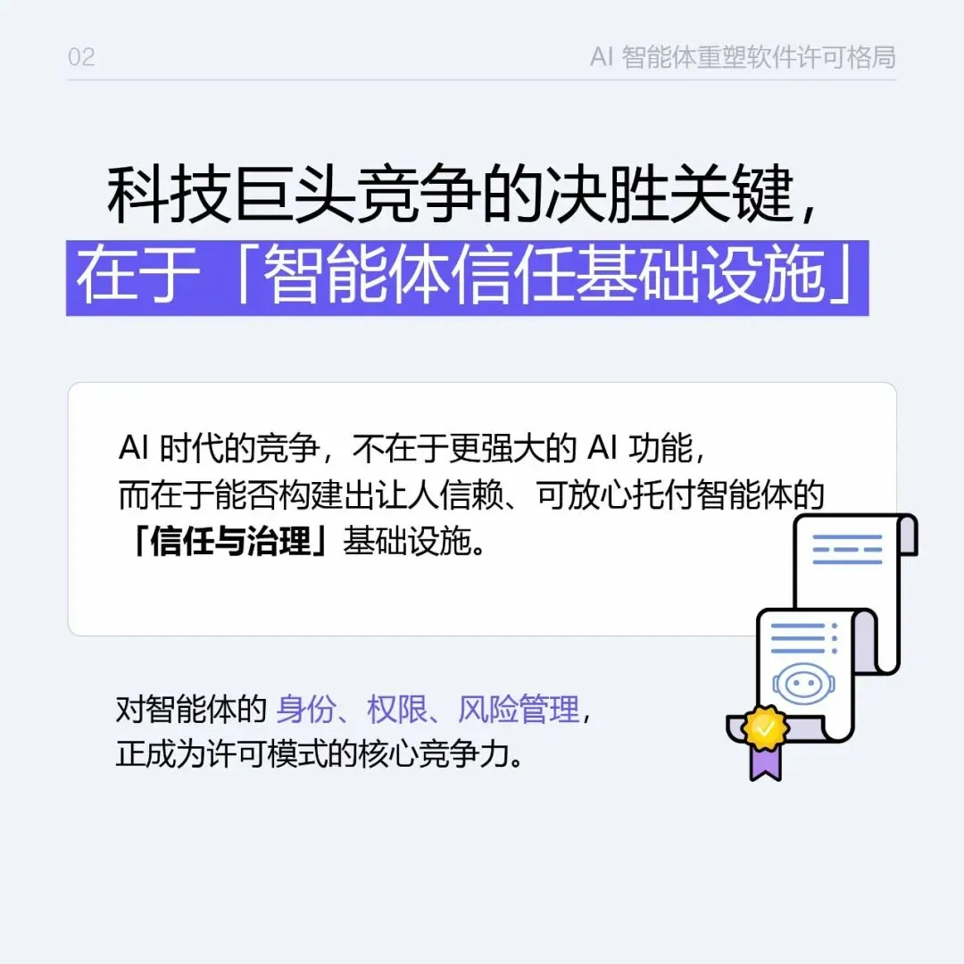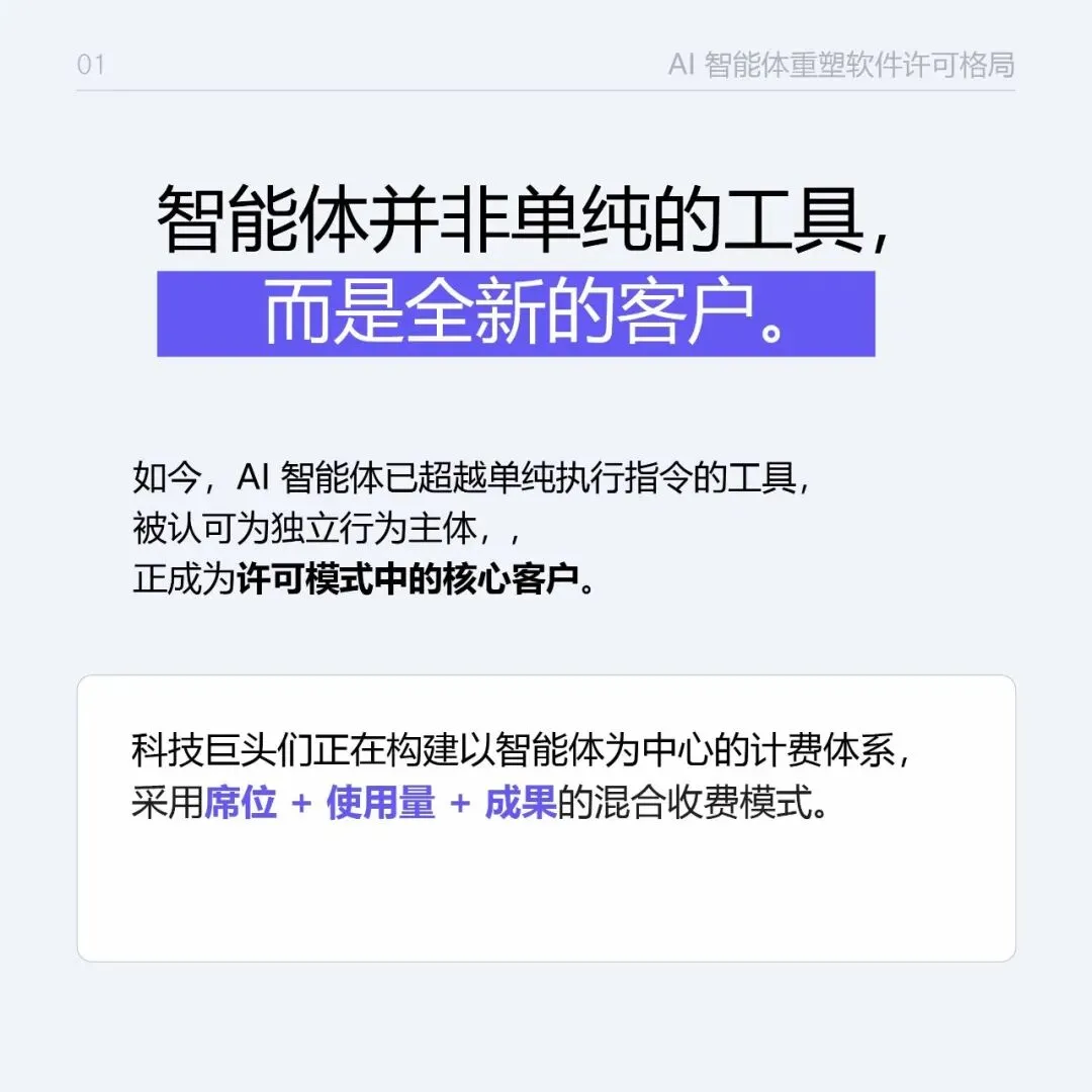 AI智能体重塑软件许可的格局 AI 从工具变 “付费客户”, 软件许可规则彻底改写! 告别按人头收费,转向按智能体行为 / 成果计费, 信任与治理基建,成科技巨头竞争核心, 企业需重构 AI 治理、倾斜资源、落地智能体项目。 这场行业变革,你跟上了吗?👇