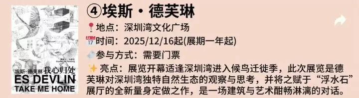 ✨ 亮点:国际艺术家埃斯・德芙琳亚洲首展,结合深圳湾候鸟迁徙元素,LED 屏幕 + 手绘素描装置,沉浸式体验艺术与自然的对话