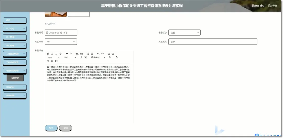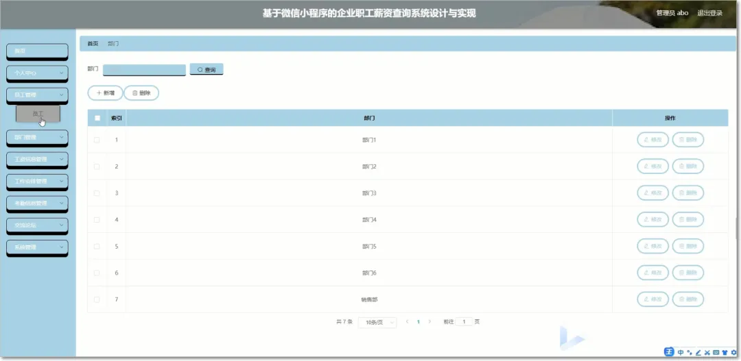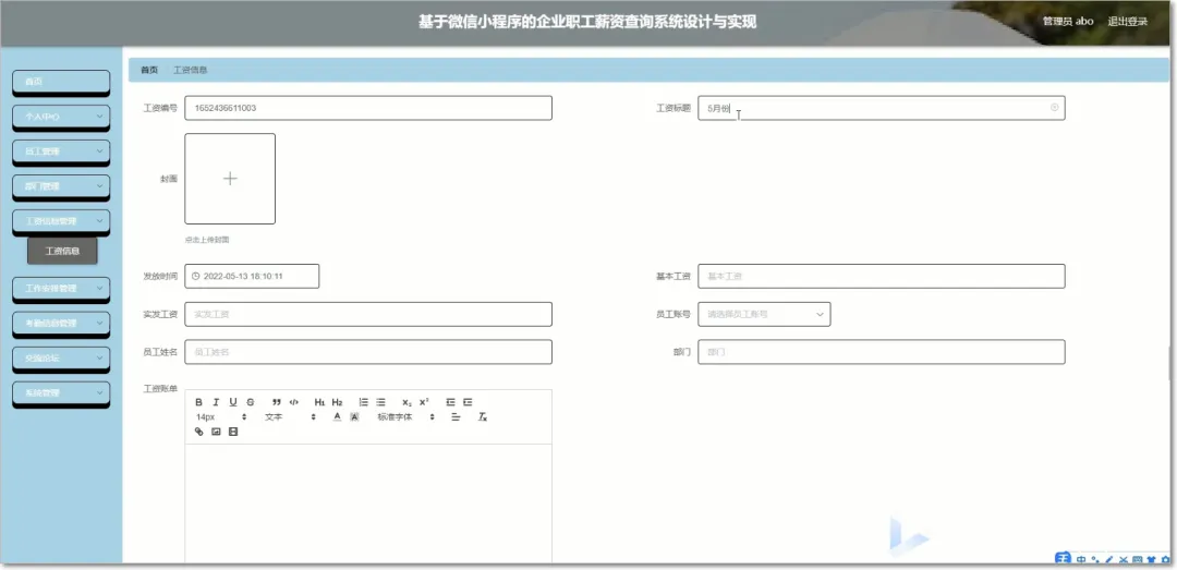 本基于微信小程序的企业职工薪资查询系统正是采用计算机技术和网络设计的新型系统,可以有效的把工资信息与网络相结合,为用户提供工作帮助和管理需求。本系统采用MySQL数据库存储数据,兼容性更强,可跨越多种平台,采用的框架为SSM。主要设计的内容包括工资信息、部门基本信息、考勤信息、工作安排信息,员工可以查看工资、考勤、工作安排和公告资讯。