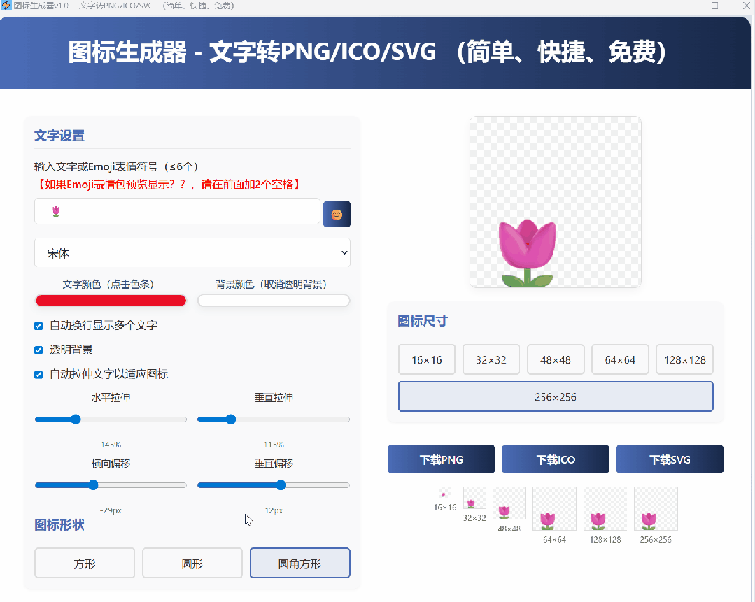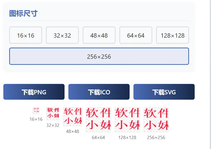 生成的图标有各种尺寸,有16×16、32×32……128×128还256×256可供大家选择下载。