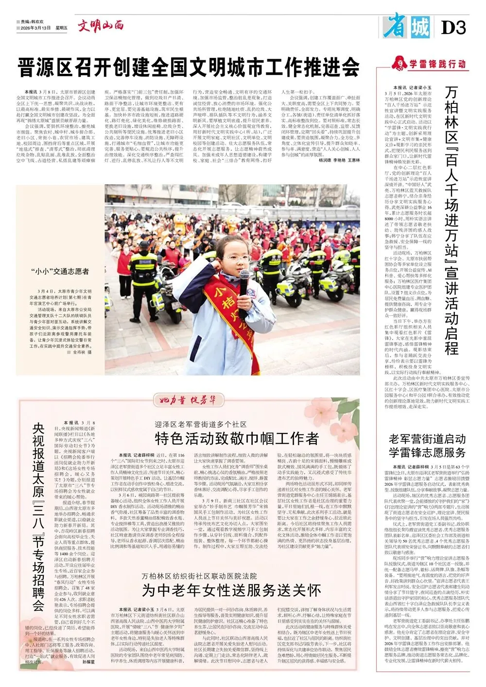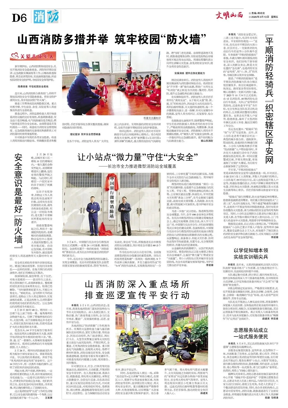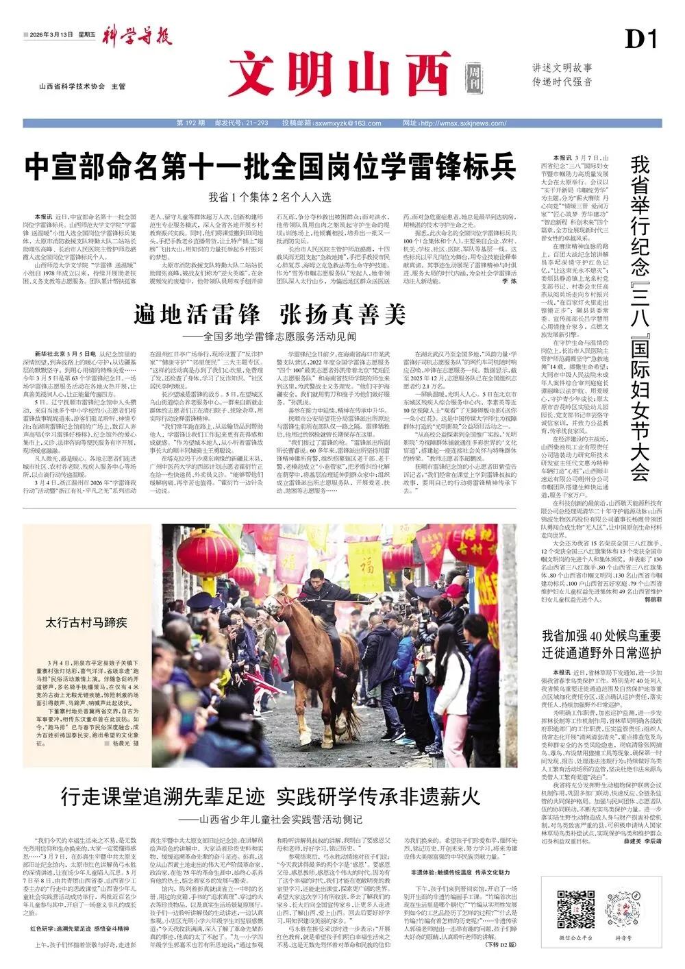 《文明山西》周刊3月13日电子版 核心提示 《文明山西》周刊由山西省文明办指导、科学导报社主办,是全省唯一的精神文明类报纸,对开八版,每周五出版,重点宣传山西省群众性精神文明“五大创建”活动、新时代文明实践中心建设、道德典型选树、学雷锋志愿服务等精神文明建设工作,兼顾报道全国各地精神文明创建活动先进经验和创新举措。 关注文明山西周刊视频号,观看更多精彩视频! 编 辑|郭 菲 审 核|常雅丽 ▍转载:如果转载请注明出处 ▍转载此图文仅为传递公众信息,若侵权请联系我们,我们将及时更正、删除,谢谢。 ▍邮箱:sxwmxyzk@163.com