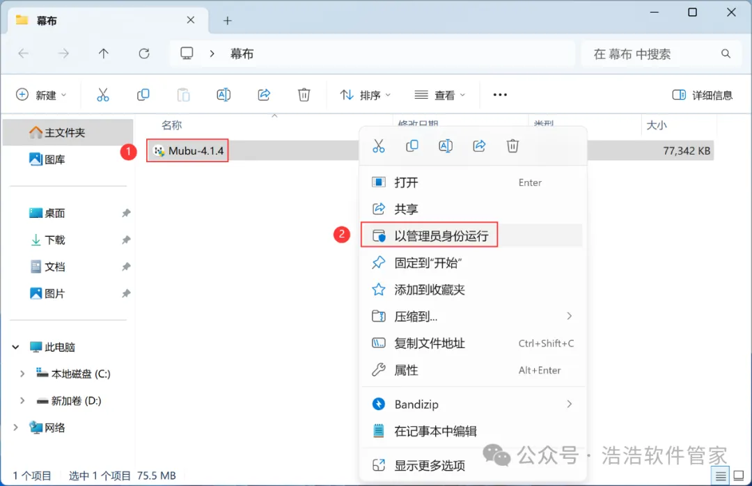 3、找到【幕布】应用程序,右键选择【以管理员身份运行】它