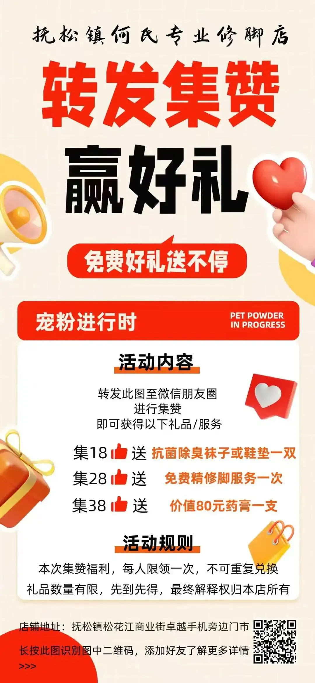 【本地优惠】 【抚松镇何氏专业修脚店】宠粉福利来啦🔥🔥🔥 转发下方图片到微信朋友圈集赞,好礼免费送👇