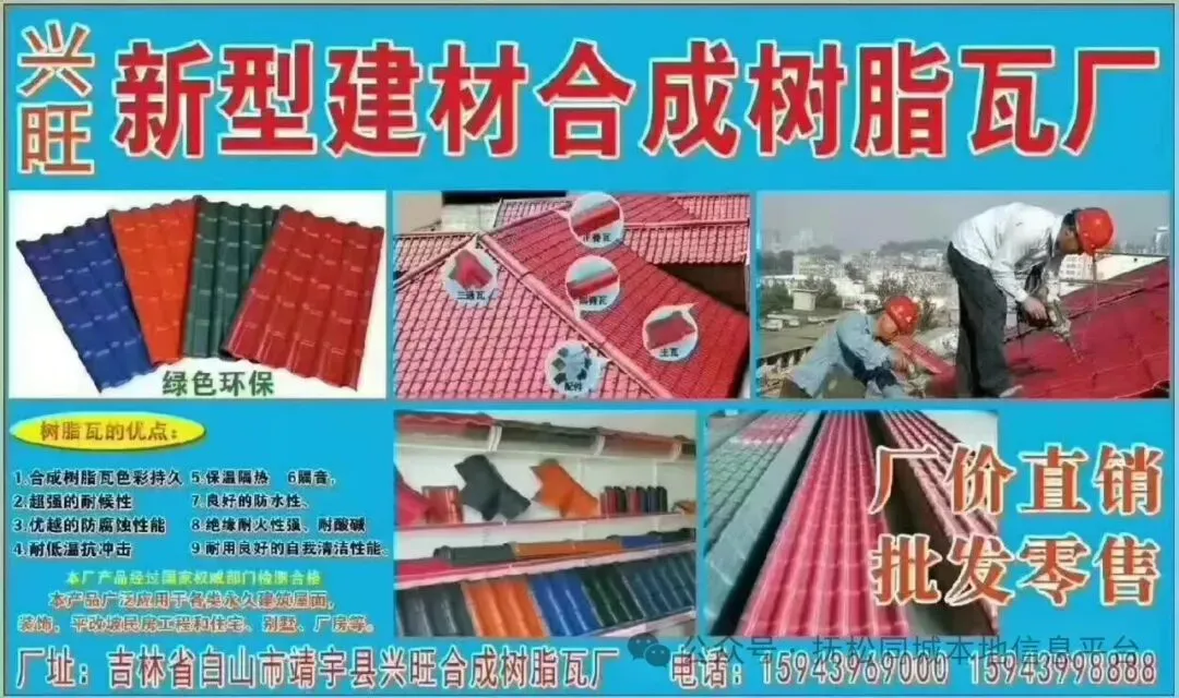 【推广信息】靖宇兴旺树脂瓦厂,绿色建材、厂家直销批发零售:彩钢房、彩钢复合板、彩钢瓦、树脂瓦、苯板、格栅、美格网、各类钢材、集装箱等/产品广泛应用于备类永久建筑屋面,装饰,平改坡民房工程和住宅、别墅、厂房等产品经过国家权威部门检测合格厂址:吉林省自山市靖宇县兴旺合成树脂瓦厂联系电话:15943969000 15943998888