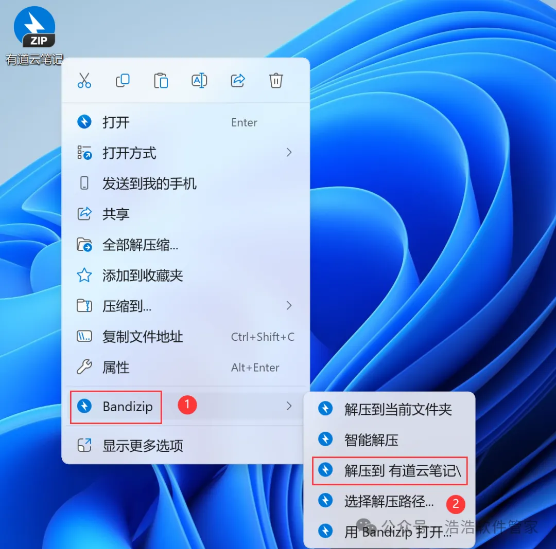 1、下载有道云笔记软件安装包到电脑上,右键选择【解压到有道云笔记\】