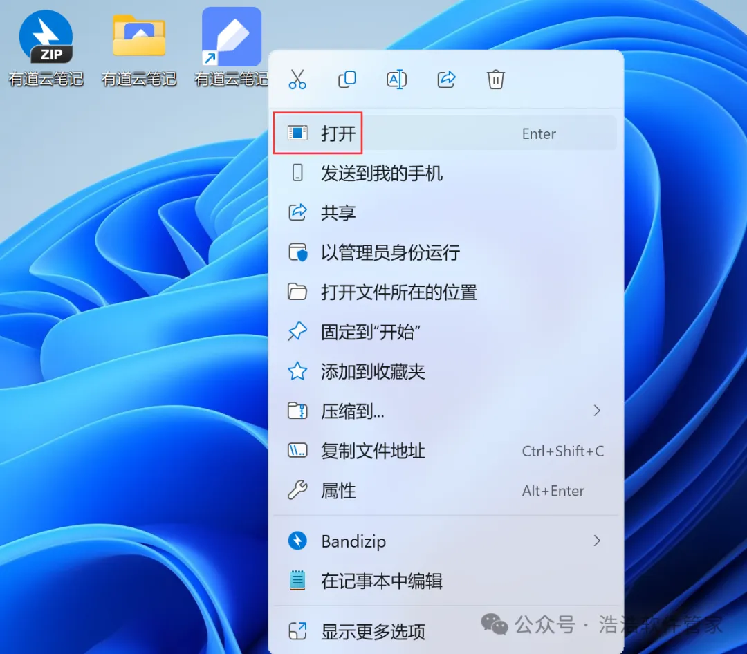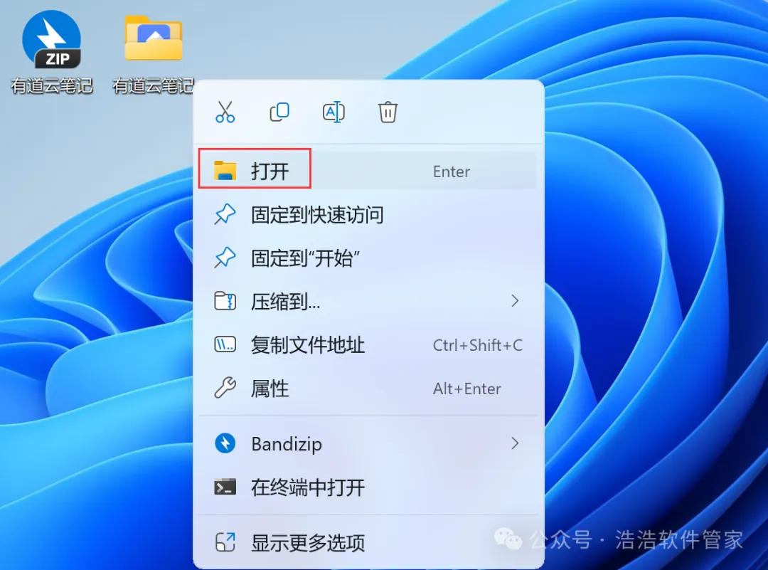 8、回到桌面,右键桌面上的【有道云笔记软件图标】,点击【打开】