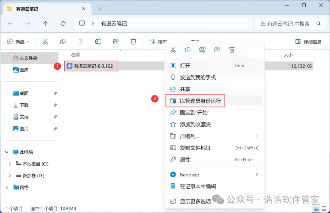 3、找到【有道云笔记】应用程序,右键选择【以管理员身份运行】它