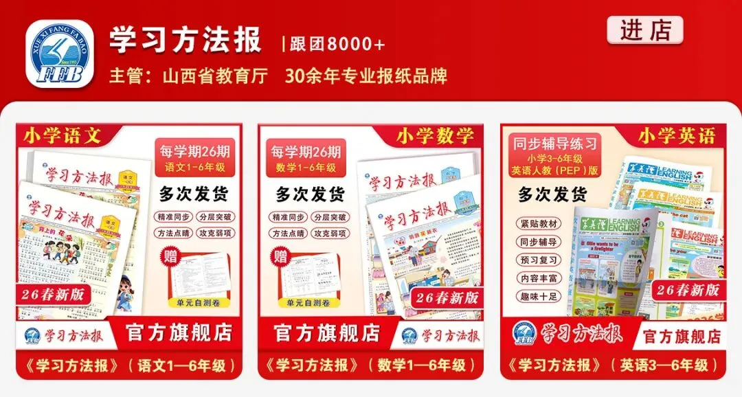别错过!超全小学学习资料,家长老师必备 语 文 数 学 英 语 练 习 纸 🔥2026春《学习方法报》,限时8.8折,火爆订购中! 💐包含:20期同步报纸——紧跟课时精讲精练;赠4套阶段自测卷——名师原创好题;《期末专号》——期末复习必刷 请点击下方链接购买👇👇👇 编辑/排版:乔月 一校:乔 月 初审:乔 月 二校:苏 鑫 复审:刘 唱 三校:翟晓玲 终审:薛瑞丹