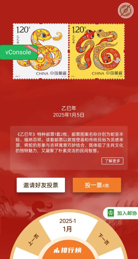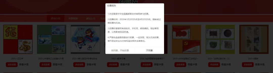 2.投票页面可以浏览所有参评邮票,可以查看活动介绍、投票规则、通知公告等。点击投票按钮参与投票。