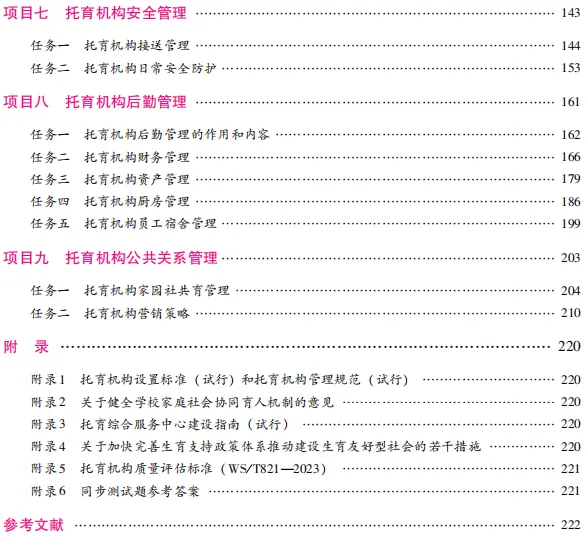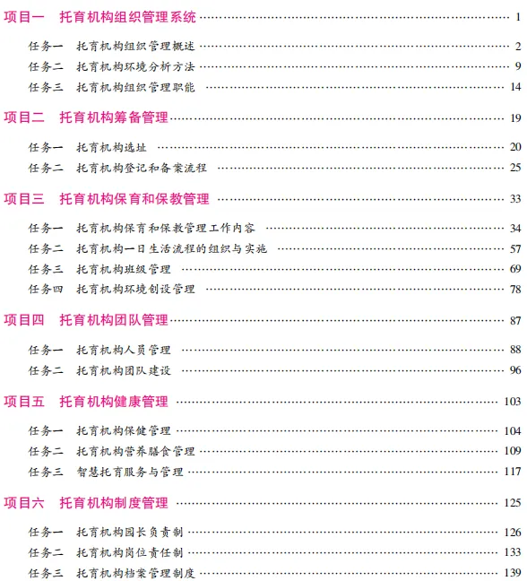 本书基于托育服务与管理岗位工作过程,按照项目—任务体例编写,设计了托育机构组织管理系统、托育机构筹备管理、托育机构保育和保教管理、托育机构团队管理、托育机构健康管理、托育机构制度管理、托育机构安全管理、托育机构后勤管理、托育机构公共关系管理等9个项目、26个典型工作任务、98个核心知识点,以任务驱动项目式教学。