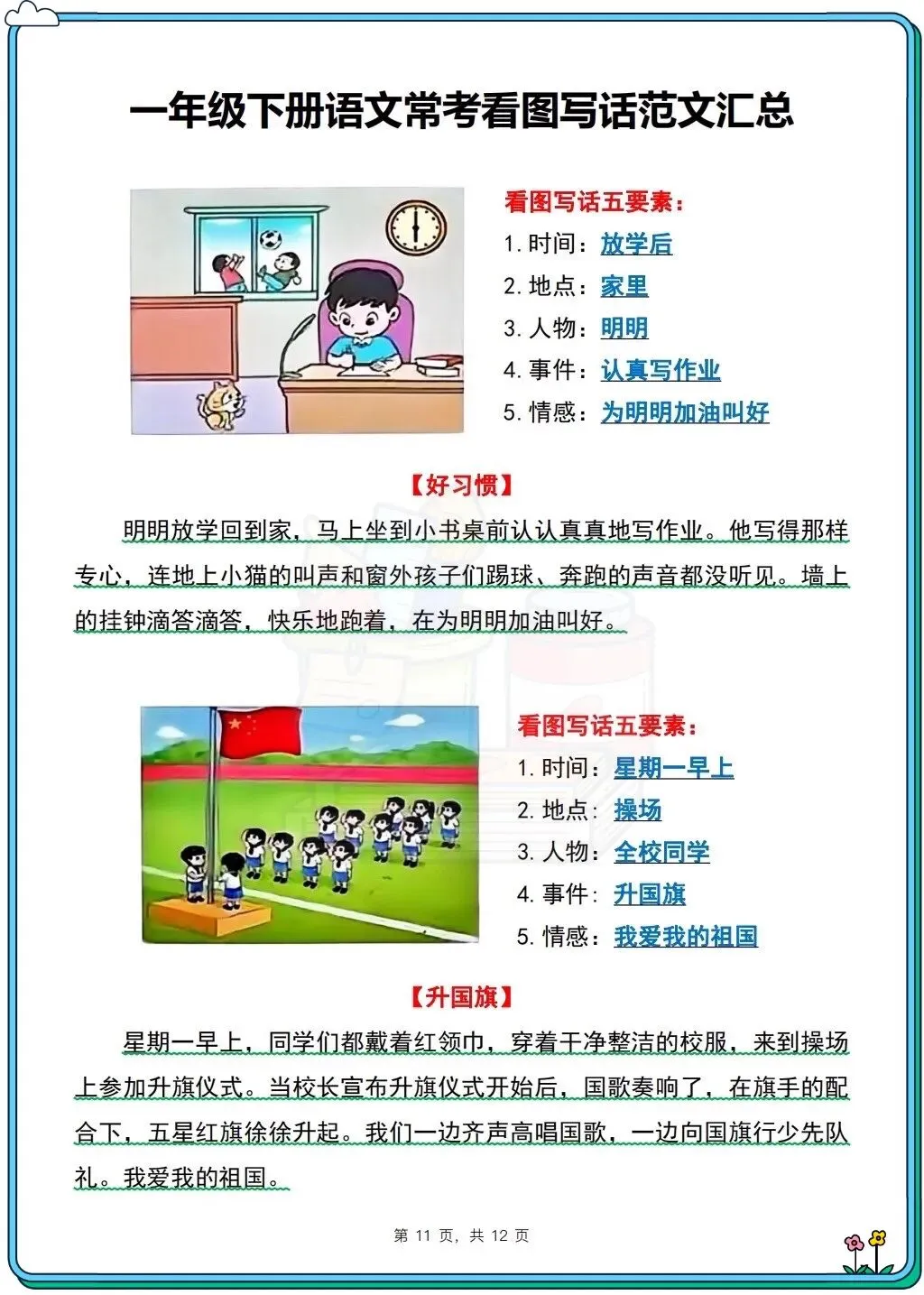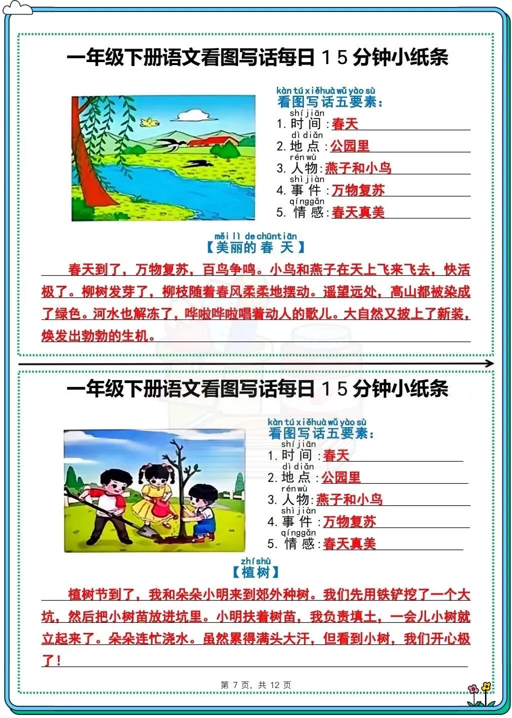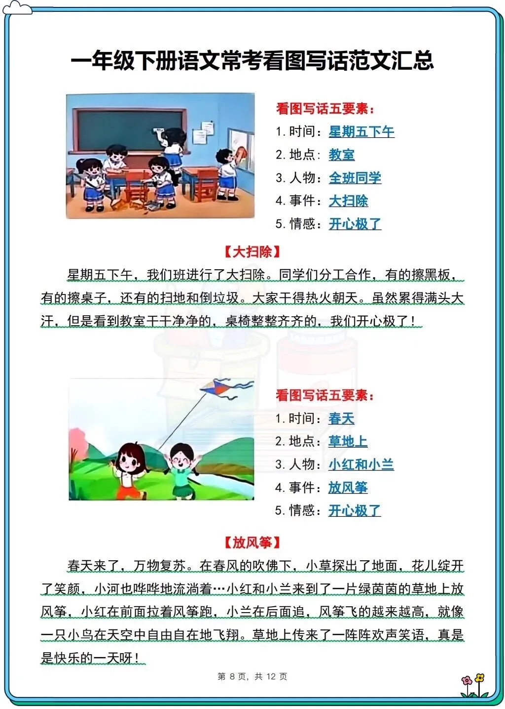这份一年级下册常考看图写话范文汇总,涵盖春天、大扫除、放风筝等高频主题,用「时间+地点+人物+事件+情感」五要素拆解,范文生动易懂,孩子一看就会模仿,每天15分钟,为语文学习打下扎实基础!