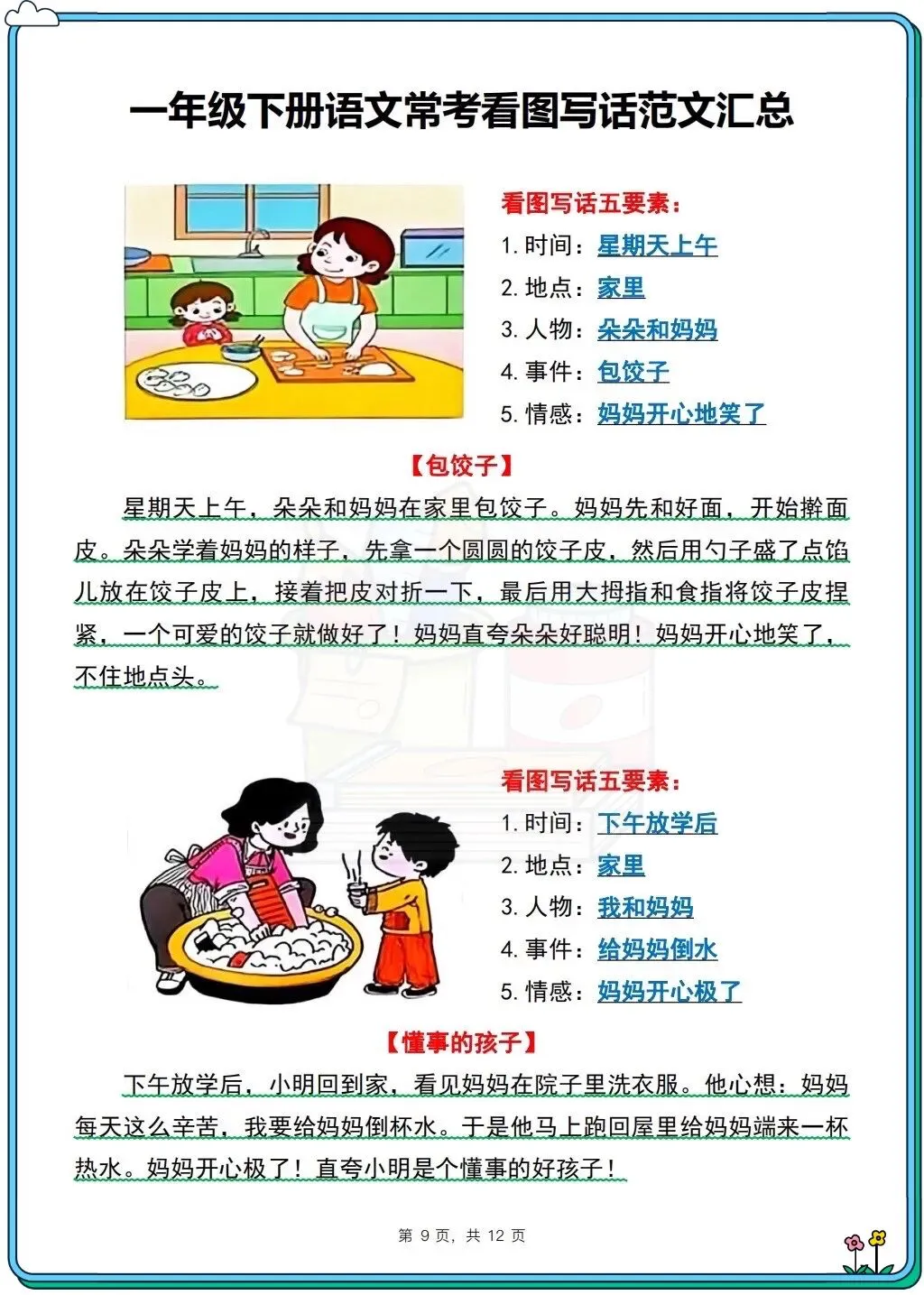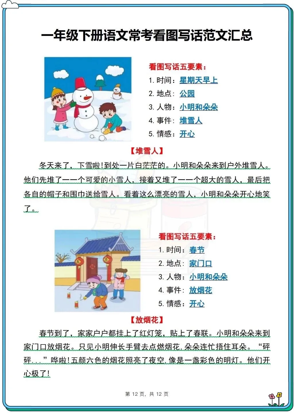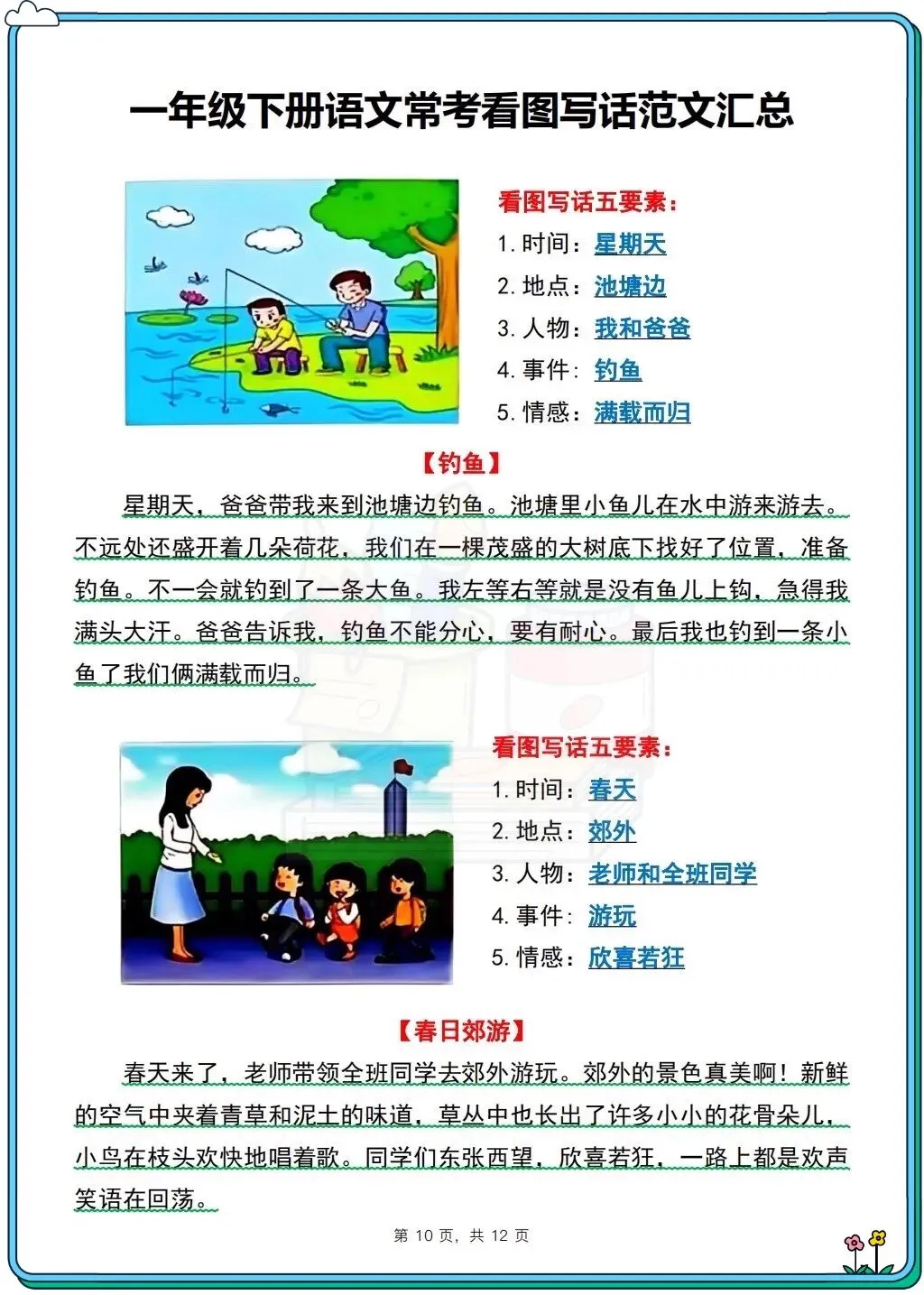 这份一年级下册常考看图写话范文汇总,涵盖春天、大扫除、放风筝等高频主题,用「时间+地点+人物+事件+情感」五要素拆解,范文生动易懂,孩子一看就会模仿,每天15分钟,为语文学习打下扎实基础!