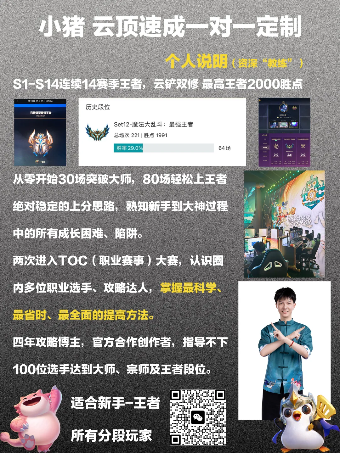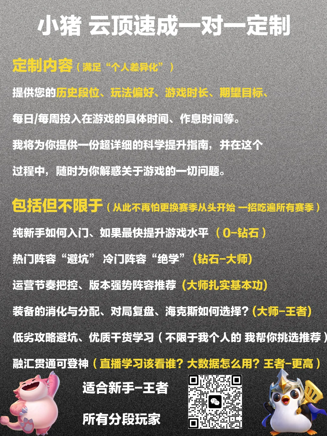 想提高游戏水平、提升段位、永久性提升游戏理解的同学可以看看小猪的指导棋定制教学,具体详聊。
