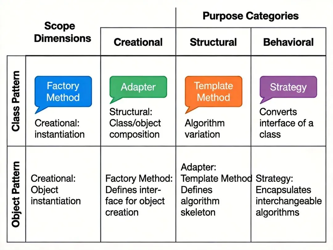 分类属性考点:考生需准确记忆每种模式所属的目的类别和范围类别,特别是唯一的 4 种类模式(工厂方法、类适配器、解释器、模板方法)是高频考点。
