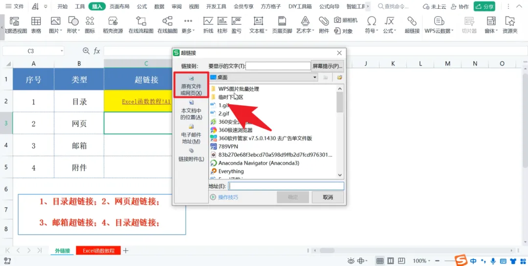 若想快速访问某个特定网页,网页超链接功能能轻松实现。按照打开【超链接】对话框的方法操作,这次选择【原有文件或网页】选项。