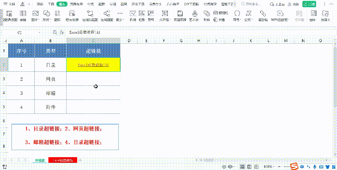 例如C2单元格。接着,点击【插入】选项卡,在众多功能按钮中找到【超链接】并点击。