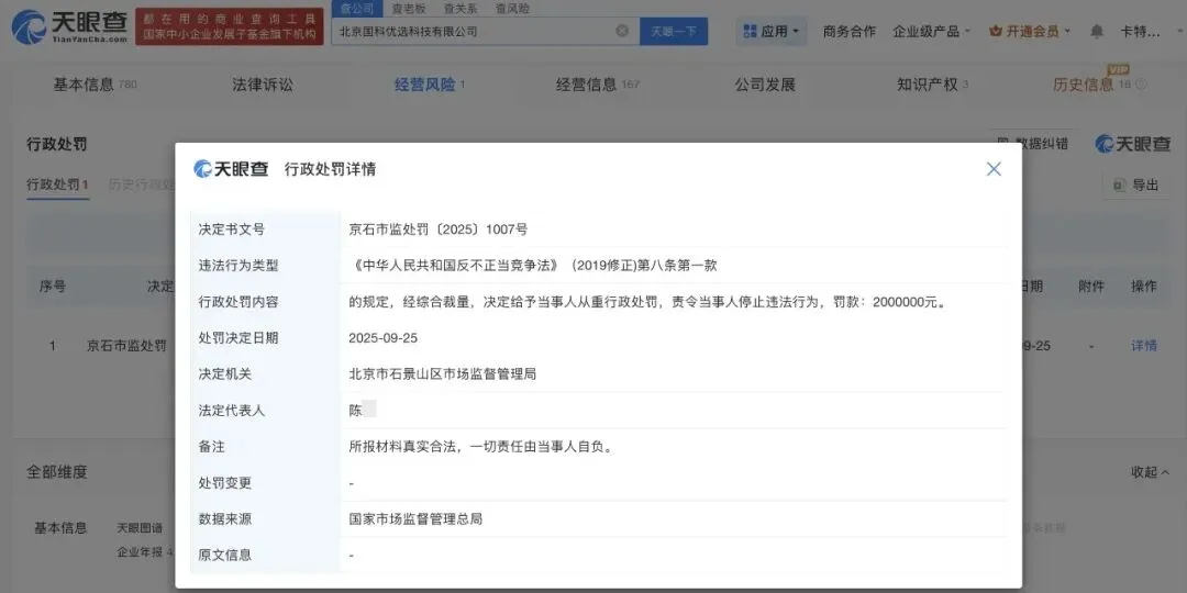天眼查显示,【北京国科优选科技有限公司】曾于去年9月25日被罚款200万元。