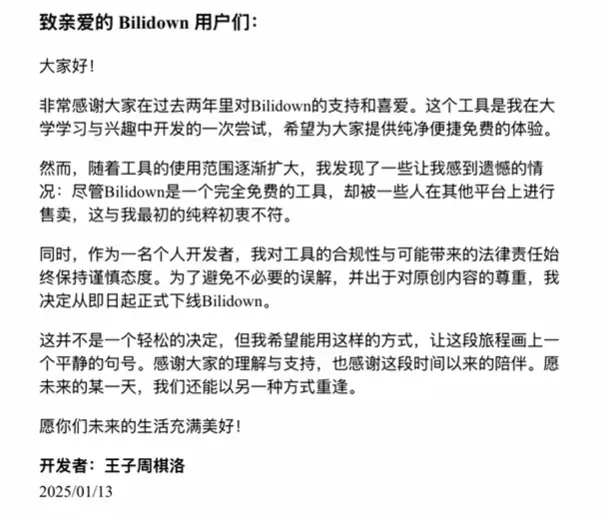 因私下盗卖问题,Bilidown开发者已宣布停止开发维护并发布公告,这款宝藏工具暂时告别大家,属实令人遗憾!且用且珍惜吧~