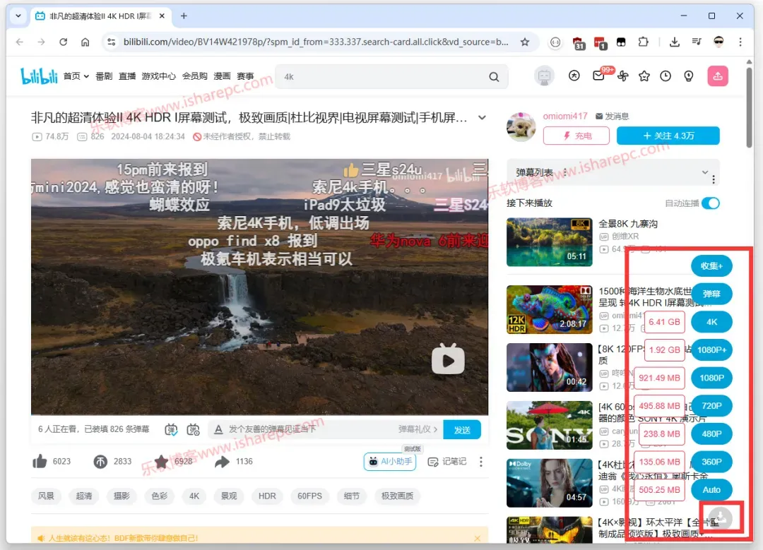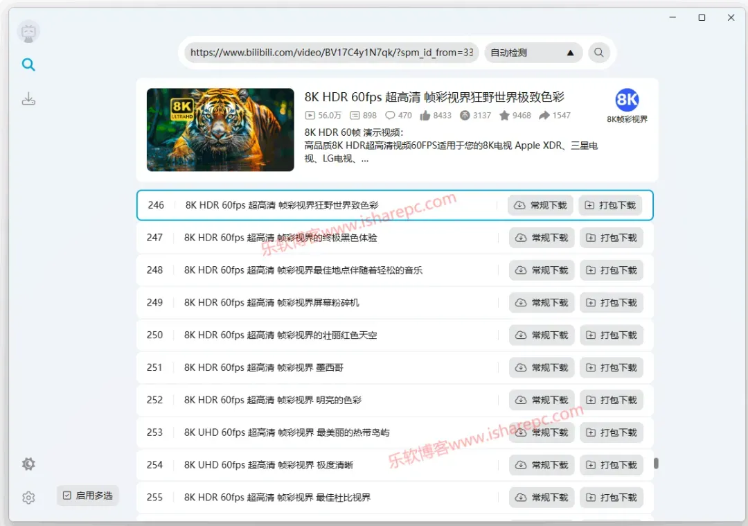 bilidown的使用非常简单,直接粘贴视频的播放链接解析即可,登录用户最高可以解析至1080P画质,大会员可以解析最高画质,比如可以解析下载8k画质。