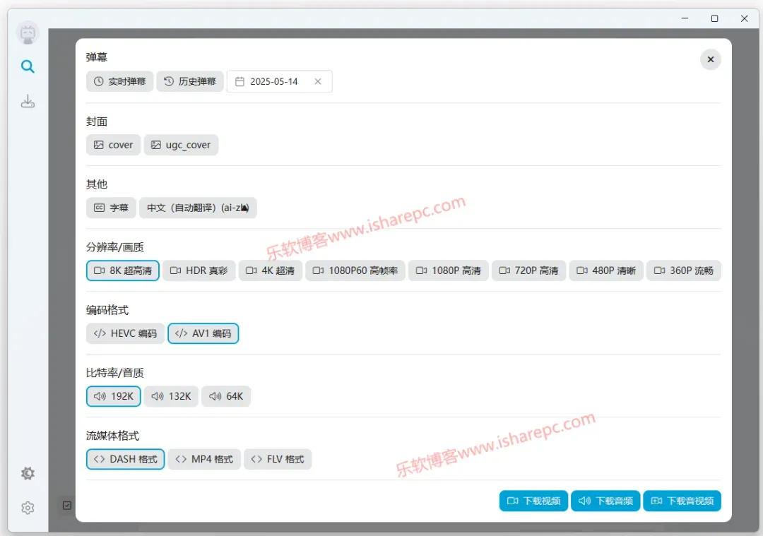 常规下载,可以自行选择想单独下载的内容,包括视频、弹幕、封面、可以选择视频画质、编码格式、流媒体格式等等。
